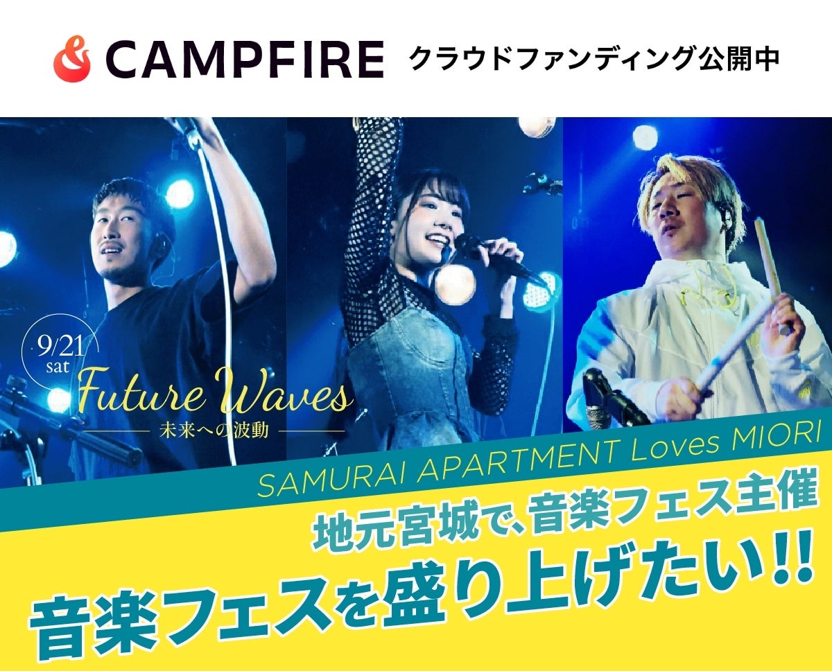 2024年9月21日、SAMURAI APARTMENTは無料音楽フェス「Future Waves -未来への波動-」を開催に伴い、2024年9月9日から9月20日迄CAMPFIREにてクラウドファンディングを行なっています。
