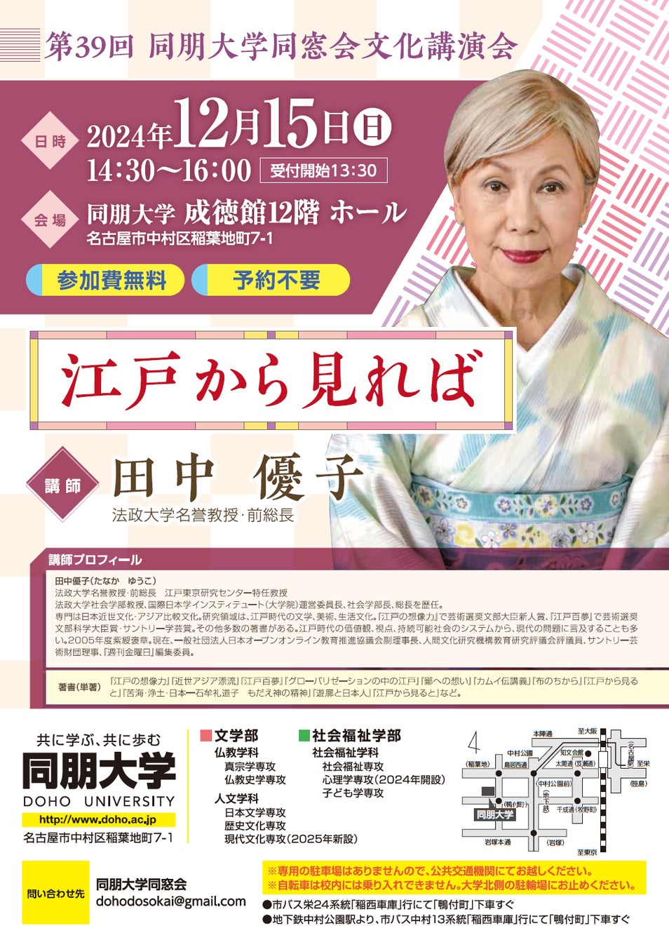 【同朋大学】12月15日(日)に田中優子氏による文化講演会「江戸から見れば」を開催します