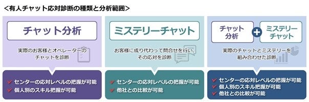 「有人チャット応対診断サービス」は、「チャット分析」と「ミステリーチャット」 の2種類をご用意しており、企業の課題や目的に応じてお選びいただけます。