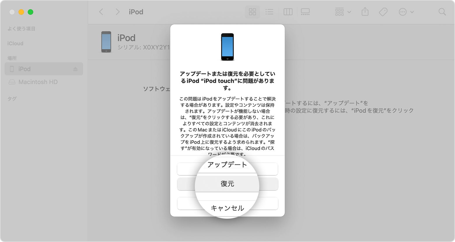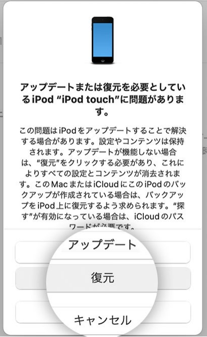 Step2:iTunesのメッセージが表示されたら「復元」を選択します。