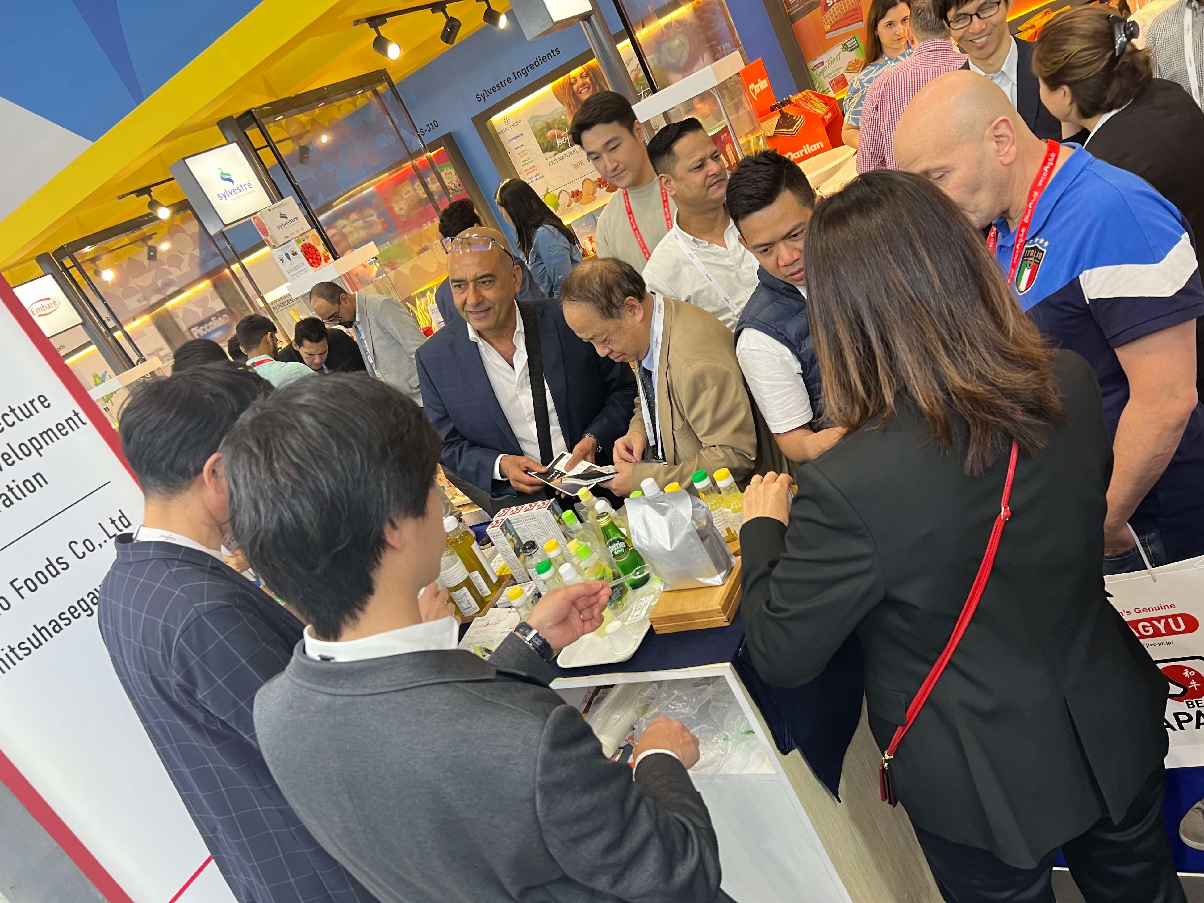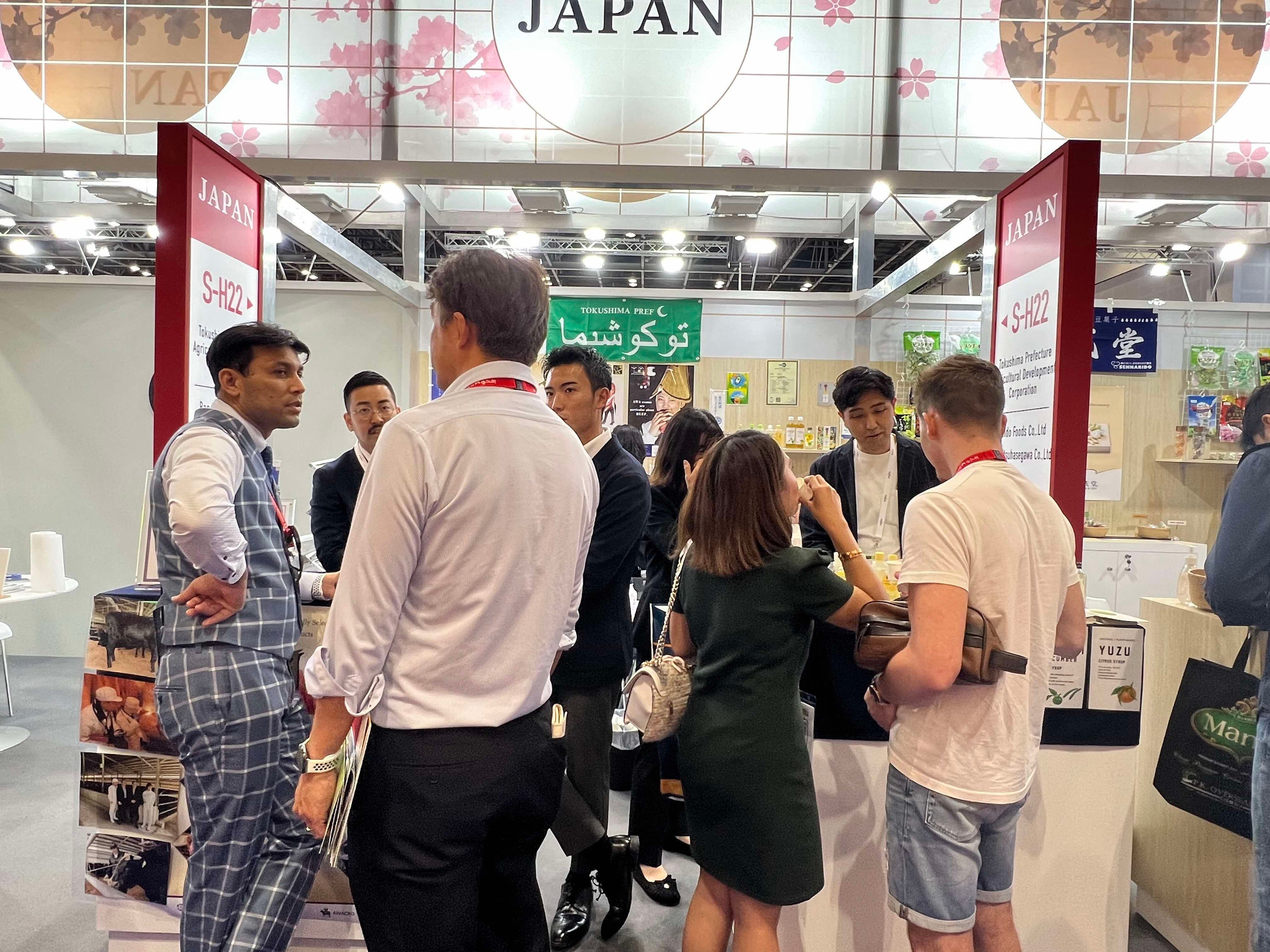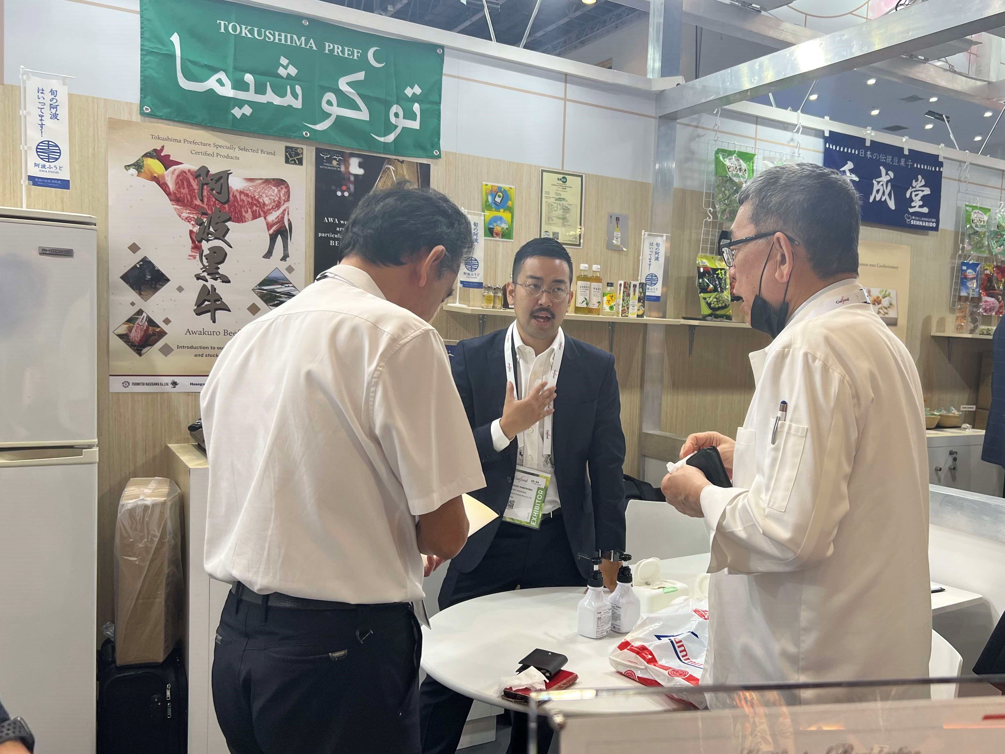 徳島県ブースには、UAE、サウジアラビアなど中東諸国を中心にアジア、北米、EU等世界各国のバイヤーや飲食事業者が訪れ、各事業者は試食を交え積極的に県産品を売り込みました。