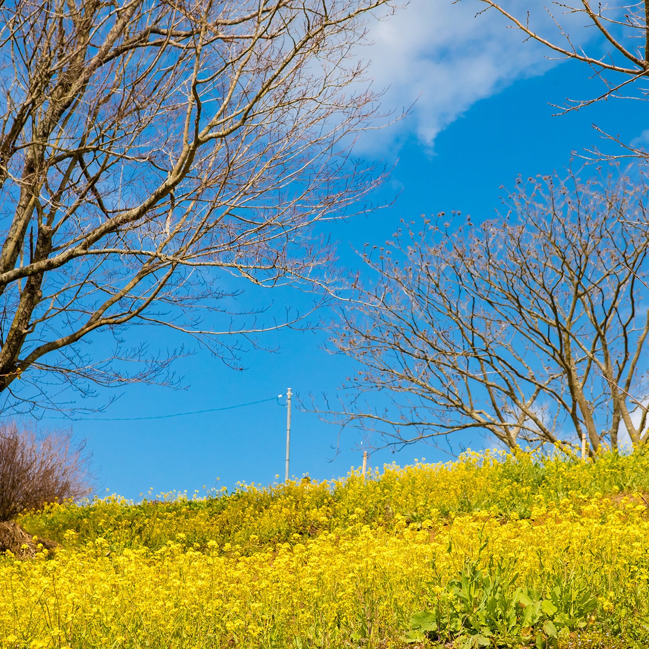 春になると菜の花が一面に咲き誇り、丘一帯が鮮やかな黄色に染まります。秋にはアサギマダラが飛来し、四季折々の景色が楽しめる人気の癒しスポットです。