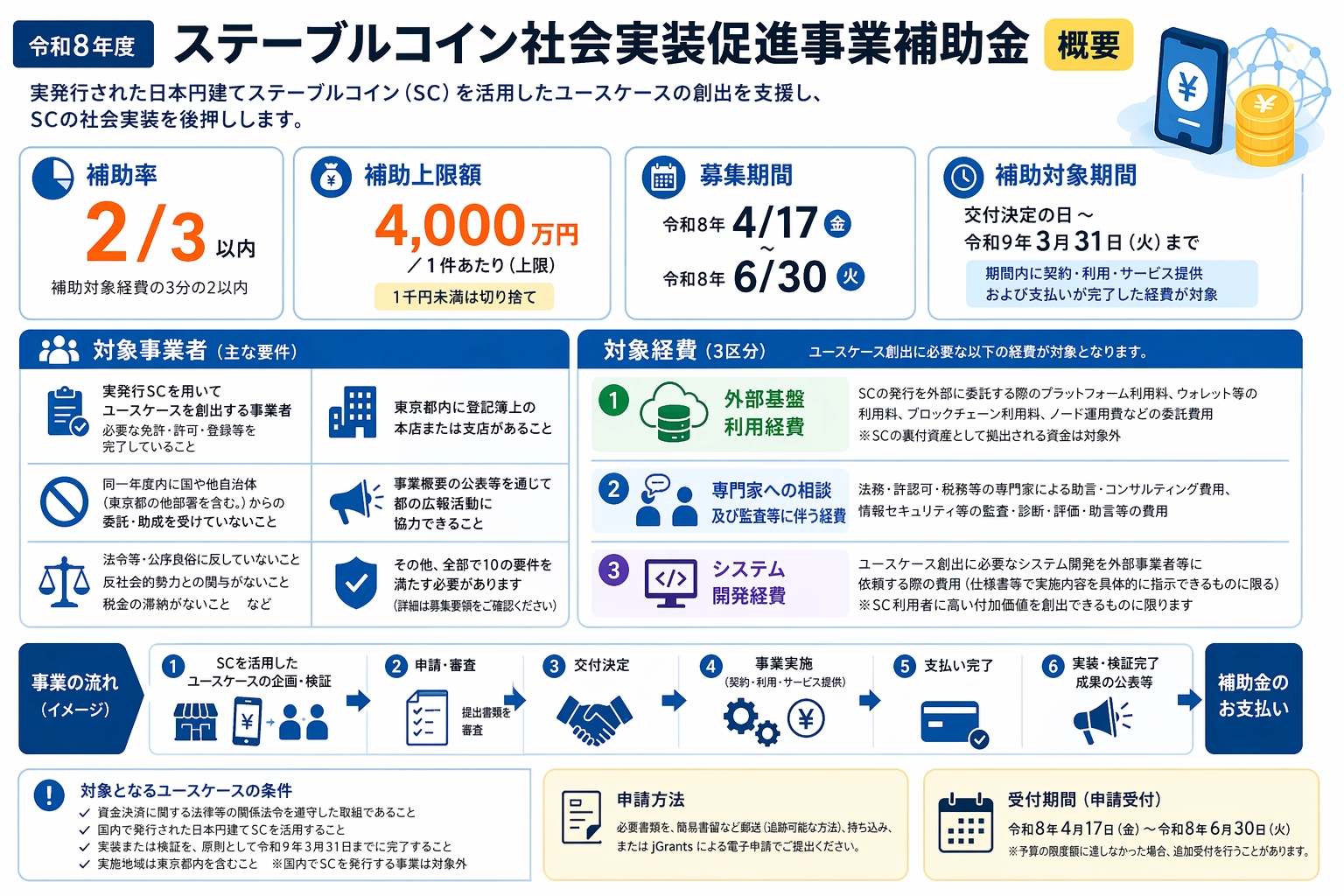 東京都は「国際金融都市・東京」戦略の一環として、2026年4月17日に「ステーブルコイン社会実装促進事業補助金」の公募を開始しました。本制度は、円建てステーブルコインを用いたユースケースを創出する都内事業者を対象とし、対象経費の2/3以内、1件あたり最大4,000万円を補助するものです。