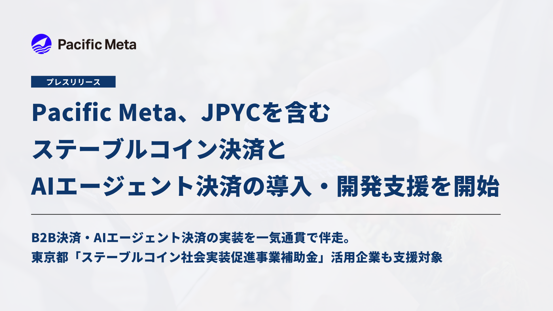 株式会社Pacific Meta(本社:東京都港区、代表取締役社長:岩崎 翔太、以下「当社」)は、2026年4月23日より、企業向けにJPYCをはじめとする円建てステーブルコインを活用したB2B決済・AIエージェント決済の導入・開発支援サービスの提供を開始します。決済ユースケース設計からスマートコントラクト開発、AIエージェント決済の実装、法務・監査対応までを一気通貫で伴走し、東京都「ステーブルコイン社会実装促進事業補助金」の活用検討企業も支援対象とします。初回無料のコンサルティングも実施します。
