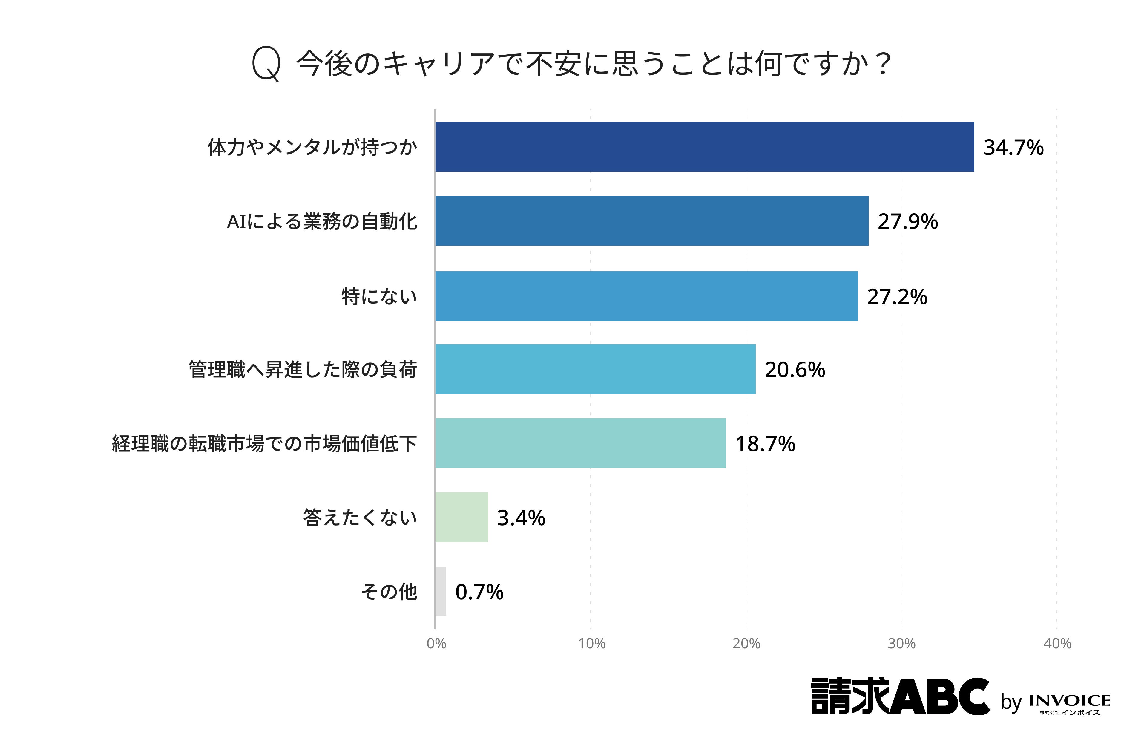 加えて、今後のキャリアに対する不安要素に関する調査では、「体力やメンタルが持つか」(34.7%)が最も多い結果となりました。次いで「AIによる業務の自動化」(27.9%)、「管理職へ昇進した際の負荷」(20.6%)、「経理職の転職市場での市場価値低下」(18.7%)と続きます。