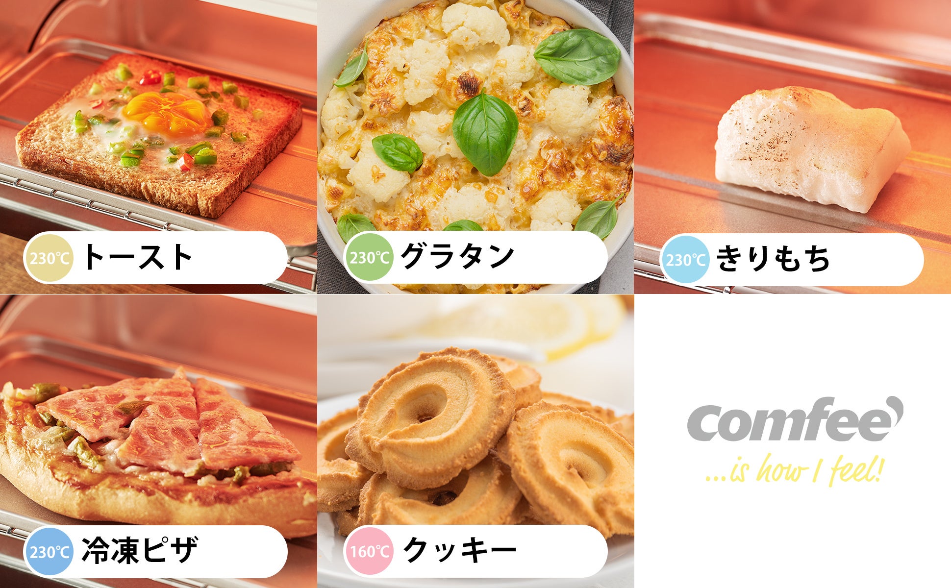 コンパクトでも高火力。上下ヒーターでムラなく焼けて、トーストもグリル料理もおまかせ。温度調節&タイマー機能で毎日の調理がもっと自由に、もっと楽しく。COMFEE'の8Lオーブントースター。