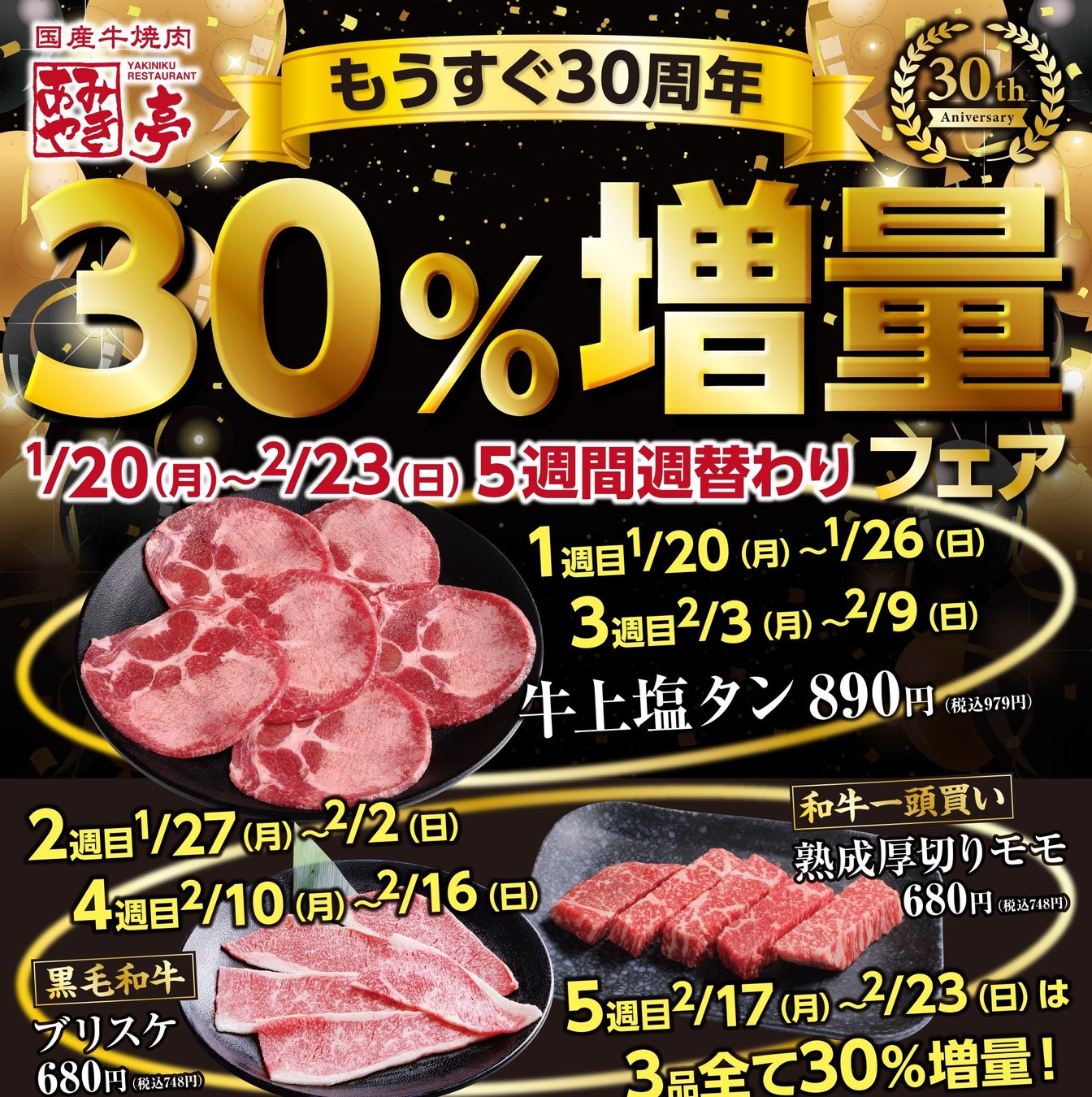 あみやき亭もうすぐ30周年!5店舗限定で対象商品『30%増量フェア』を開催します!