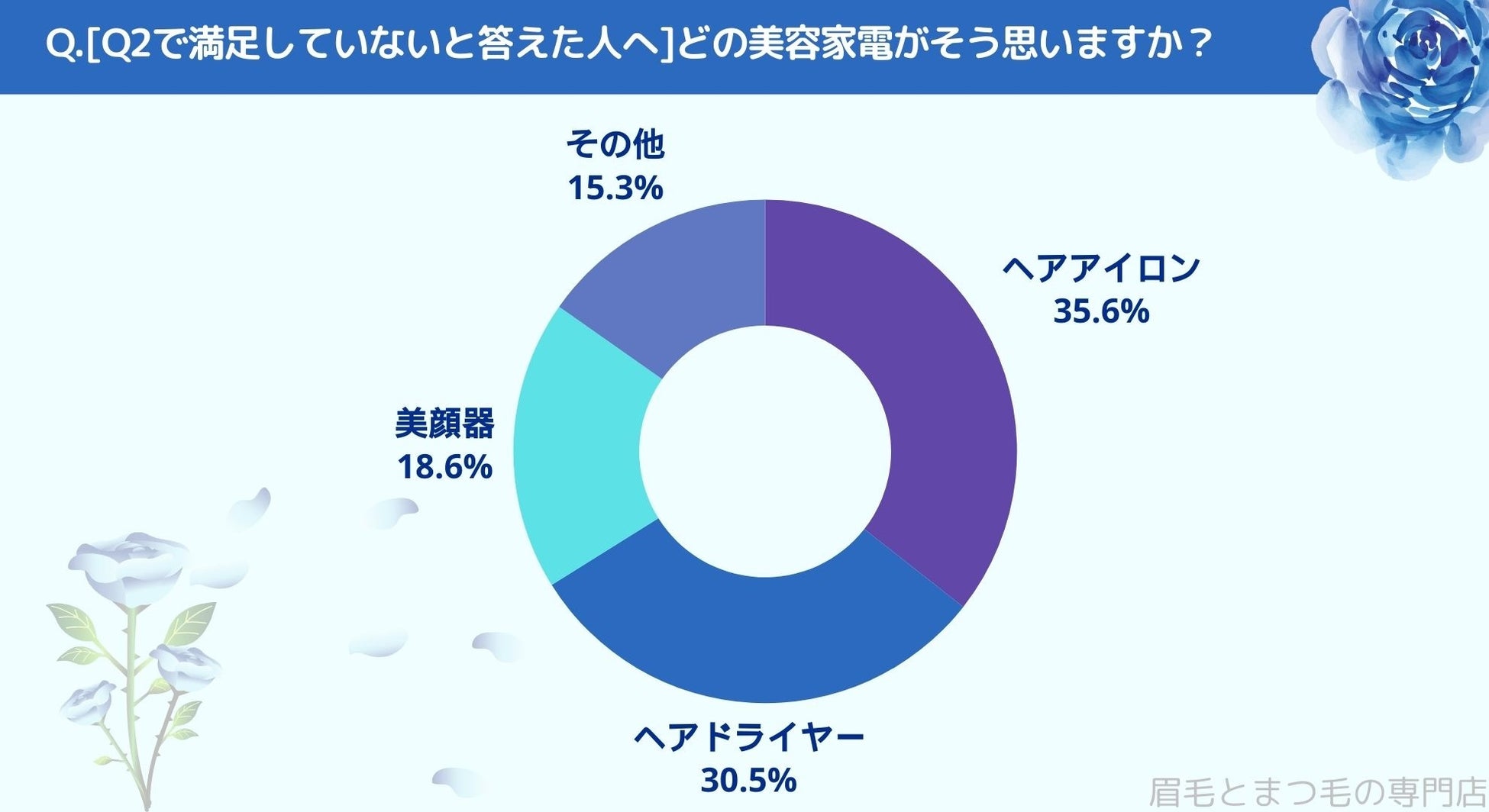 Q2で満足していないと答えた人に、どの美容家電がそう思うかお聞きしたところ「ヘアアイロン(35.6%)」、「ヘアドライヤー(30.5%)」、「美顔器(18.6%)」、「その他(15.3%)」という結果になりました。
