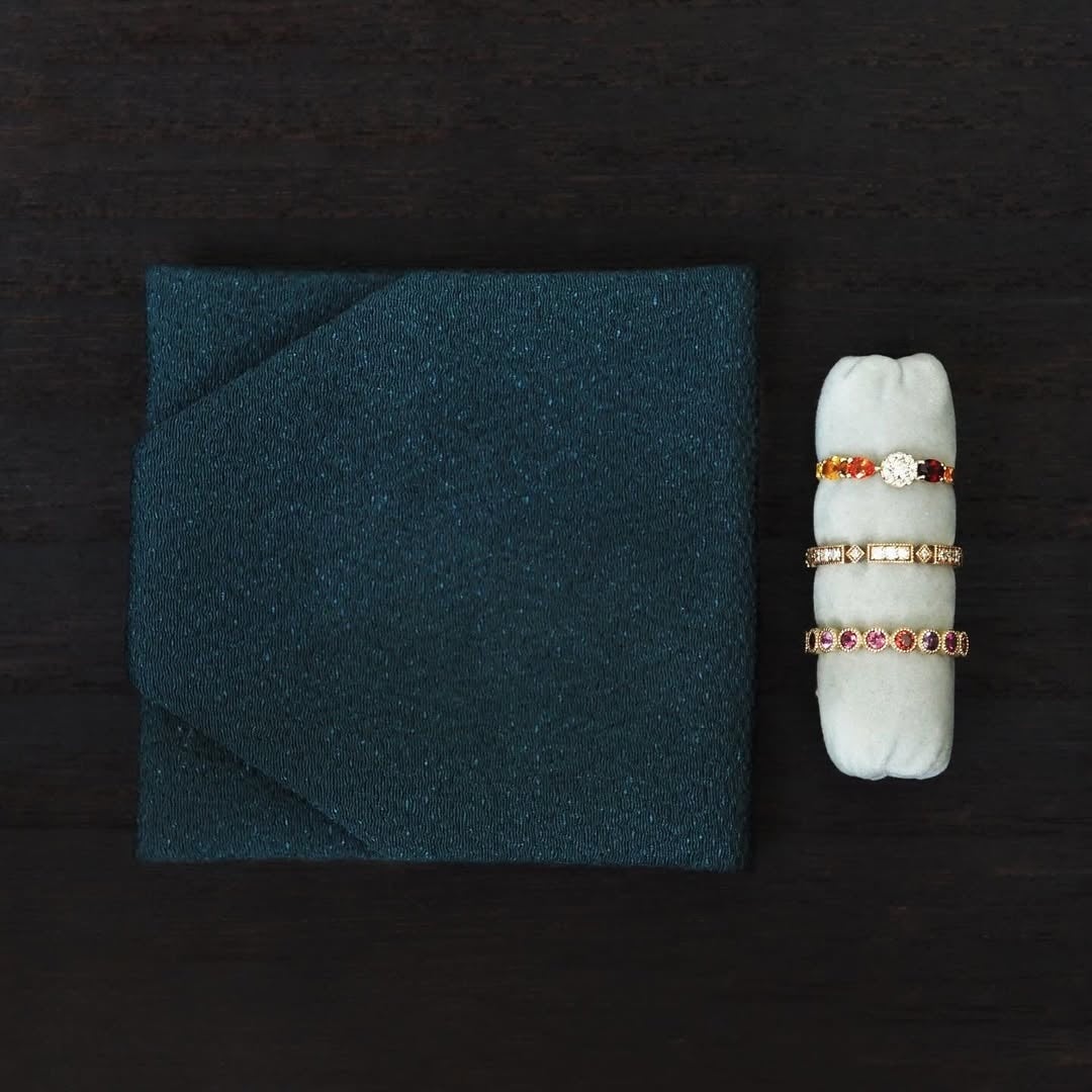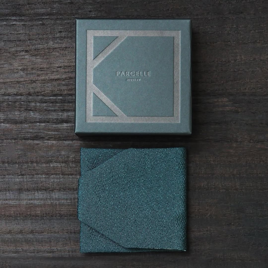 格式ある「平包み」から着想を得たこのポーチは、PARCELLE JEWELRYのロゴをモチーフにデザインされ、ふっくらとした縮緬生地とリングを固定できる内部パーツを備えた、実用性と美しさを兼ね備えた一品です。表面には、ロゴの形状を活版印刷で立体的に表現し、細部までこだわった仕上がりに。
