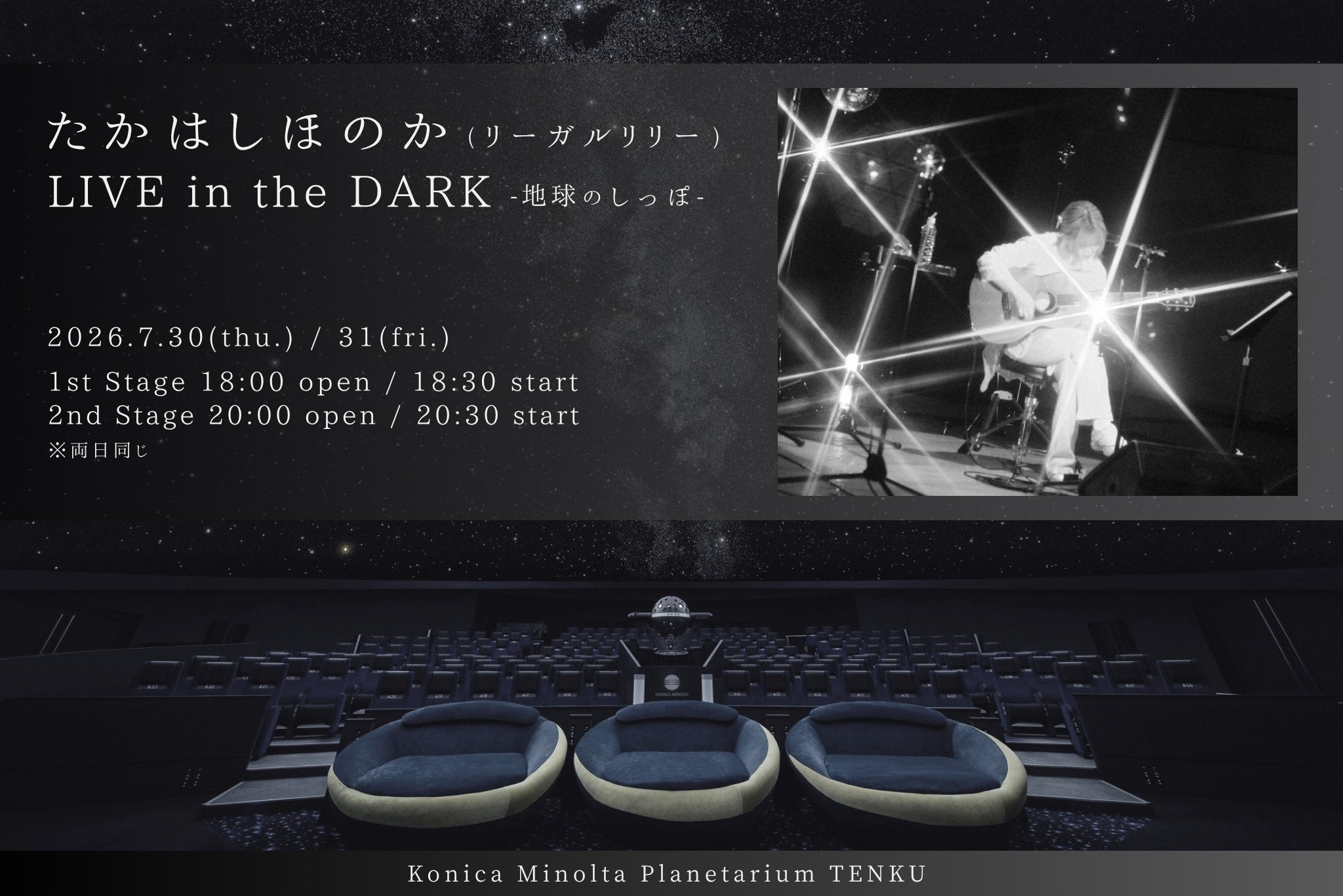 2026年7月30日(木)・31日(金)、コニカミノルタプラネタリウム天空(東京)にて『たかはしほのか(リーガルリリー) LIVE in the DARK -地球のしっぽ-』の開催が決定しました。たかはしほのかの音楽と星空が共鳴する唯一無二の世界を、ぜひプラネタリウムでお楽しみください。