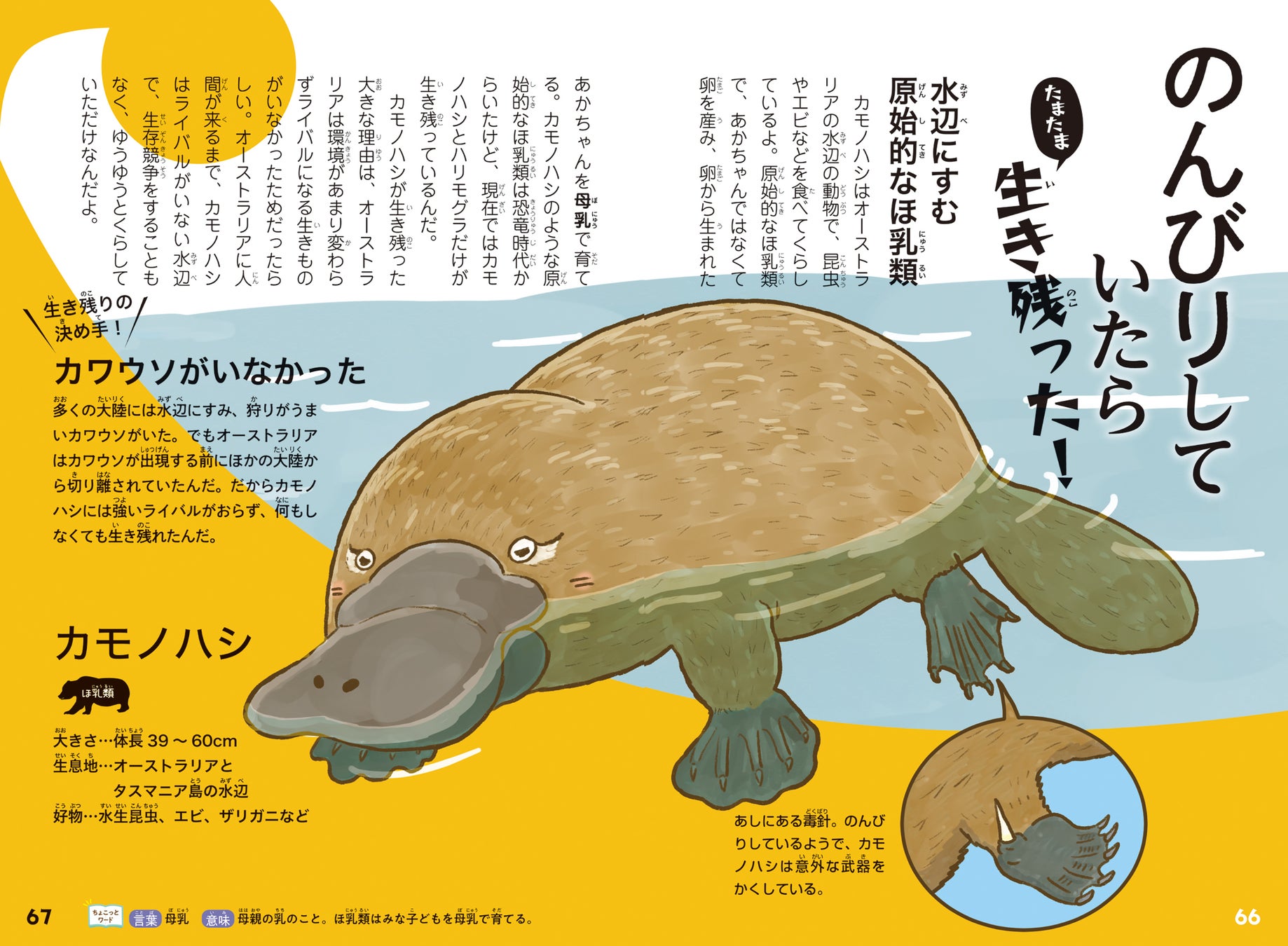 のんびりしていたら生き残った カモノハシ/しっとりした森にいたから生き残った コビトカバ/おいしい魚がいて生き残った バイカルアザラシ/からだが大きかったので生き残った シロナガスクジラ/ひっそりと深海にいたおかげで生き残った シーラカンス etc.