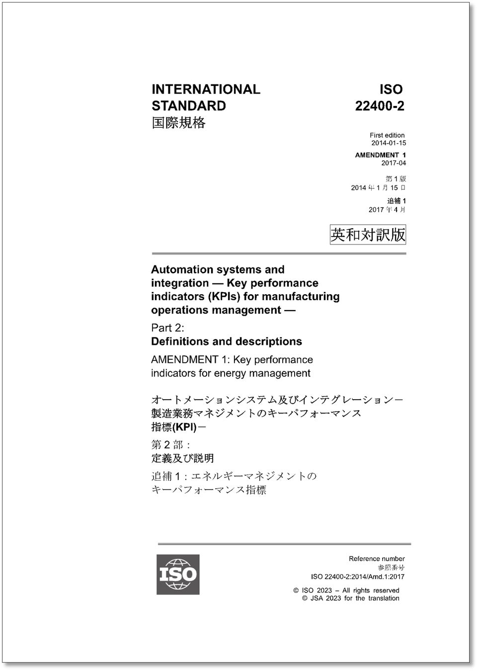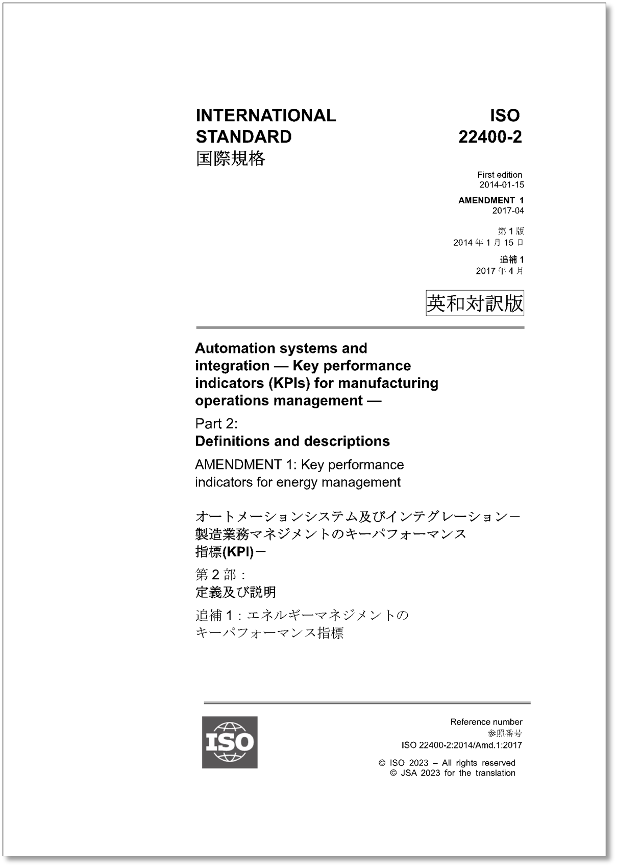 ● ISO 22400-2:2014/Amd 1:2017「オートメーションシステム及びインテグレーション-製造業務マネジメントのキーパフォーマンス指標(KPI)-第2部:定義及び説明 追補1:エネルギーマネジメントのキーパフォーマンス指標」