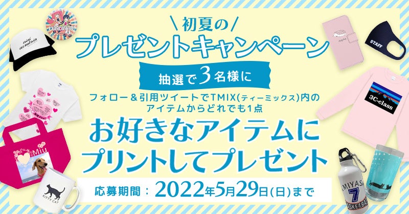 キャンペーン開催期間中、TMIXの公式Twitterアカウント https://twitter.com/tmix_jp をフォロー後、対象ツイートを引用ツイートした方の中から抽選で自分の好きな写真やイラスト・文字・スタンプでデザインできる、オリジナルアイテム どれでも好きなもの1点を合計3名様にプレゼントする「初夏のプレゼントキャンペーン」を実施いたします。