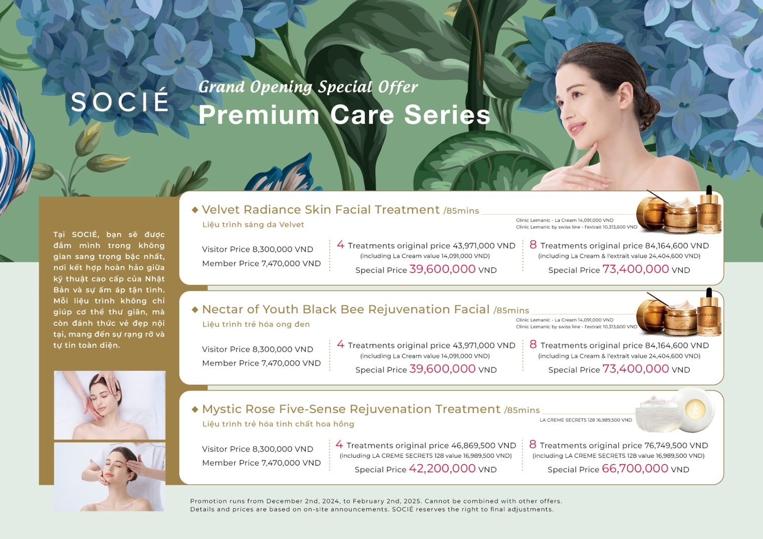 ホーチミン市のユニオンスクエアに新たにオープンする「SOCIÉ VIETNAM」は、都市で暮らす女性に贅沢で静謐なオアシスを提供します。空間デザインは「贅沢さ、細部へのこだわり、優雅さ」をコンセプトに、華麗なシャンデリア、洗練された家具を取り入れ、パリの美的感覚を表現。「日本からの美と安心」のブランドポリシーを体現し、忙しい日常の中でもまるでプライベートリゾートにいるかのような、リラクゼーションと美しさを五感で感じられる体験をお楽しみいただけます。