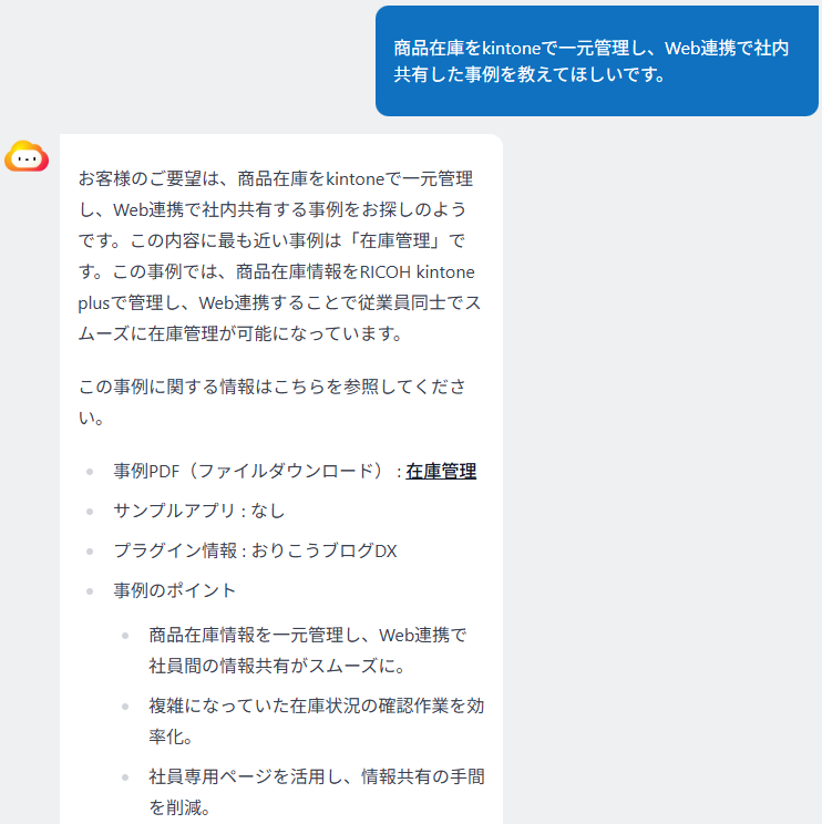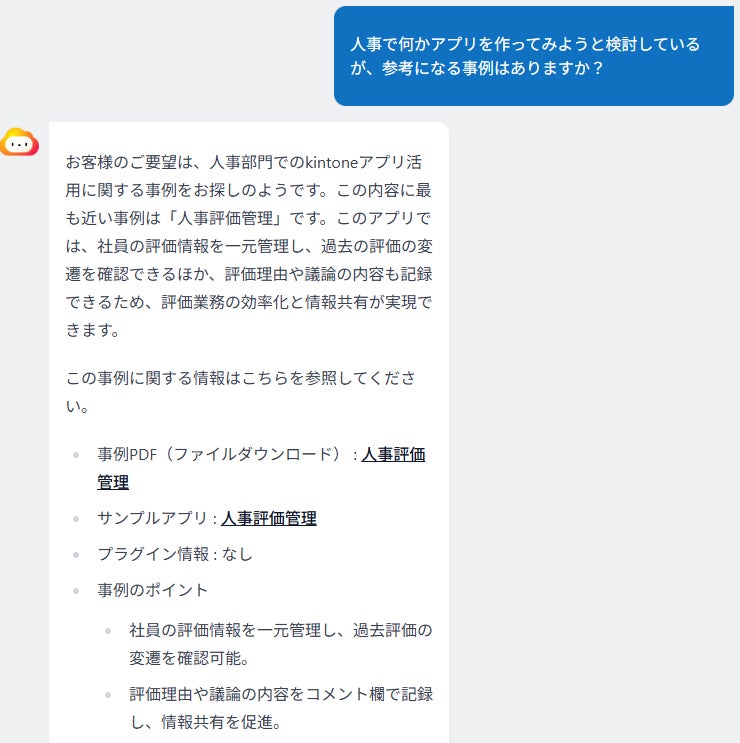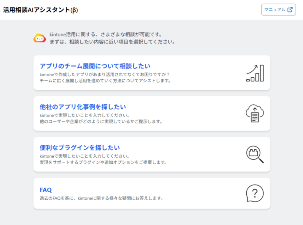 「活用相談AIアシスタント」機能は、活用推進の担当者が困りごとを気軽に相談できるチャットボット機能です。「アプリのチーム展開について相談したい」「他社のアプリ化事例を探したい」「便利なプラグインを探したい」などのカテゴリを選択したうえで質問をすると、生成AIが事例の紹介や、おすすめのプラグインなどをアドバイスしてくれるとともに、関連する事例サイトや連携ソリューション掲載サイトなどのリンクを提示します。また、アプリケーションの設定や操作方法などの相談にも対応しており、トラブル対応の支援をします。