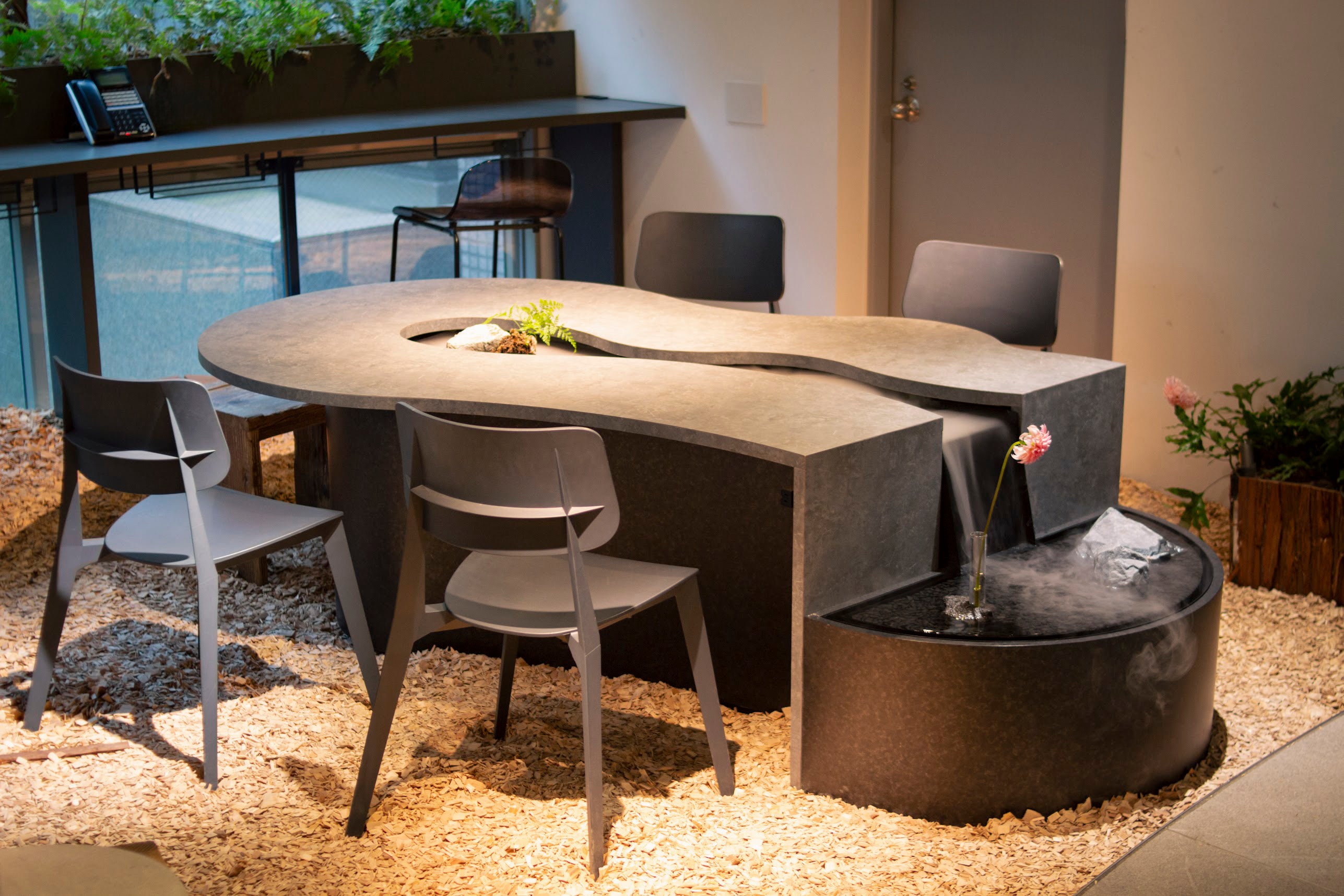 テーブル内を流れる水は、水質劣化を抑える循環システムによって清らかさを保ち、デザイン面だけでなく、人や環境への配慮も兼ね備えたテーブルとなっています。