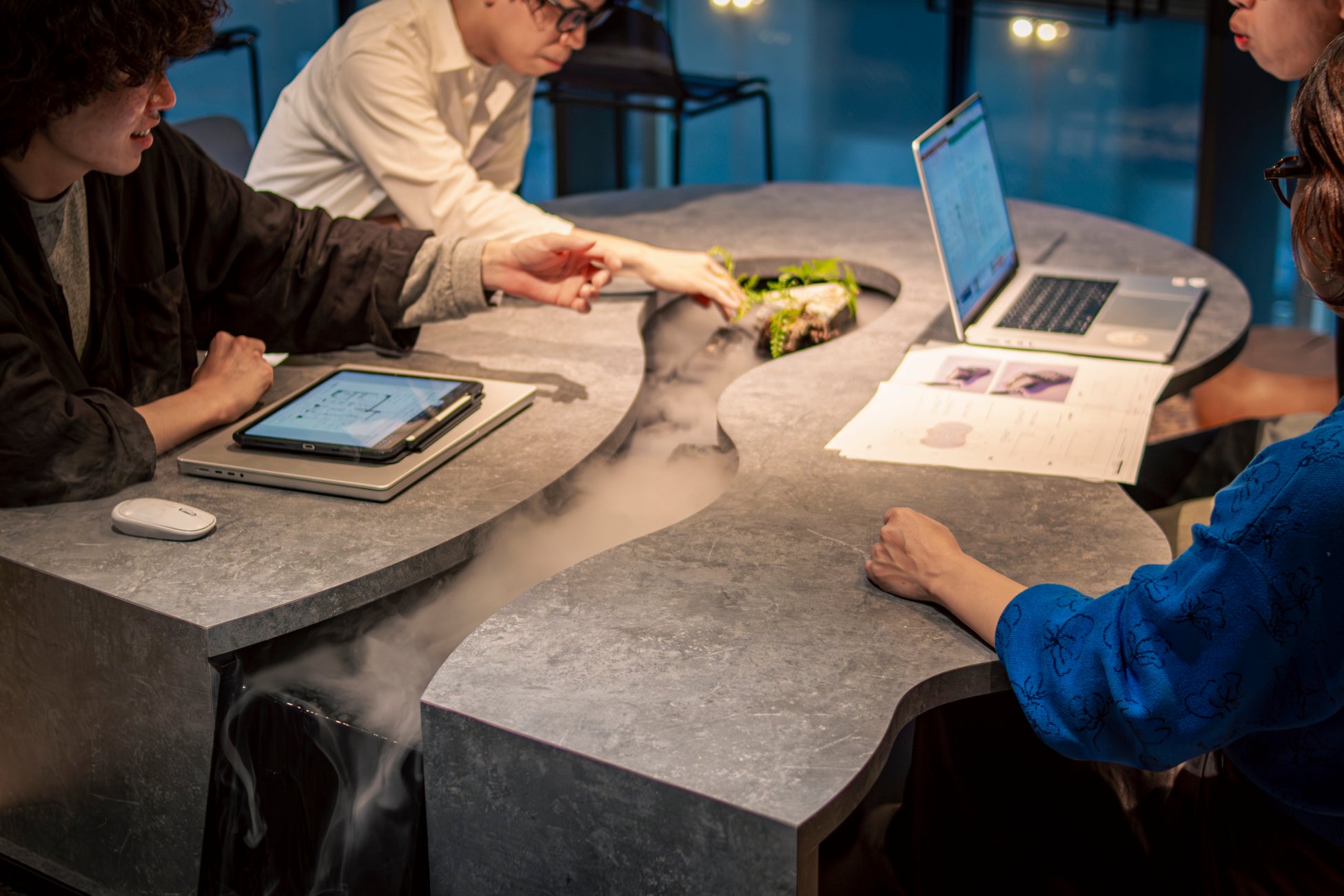 テーブル中央から発生する霧は長く滞留する仕組みをつくり、水音とともに柔らかな表情で焚き火を囲む時のような安らぎ、リラクゼーション効果を付加価値として提供します。