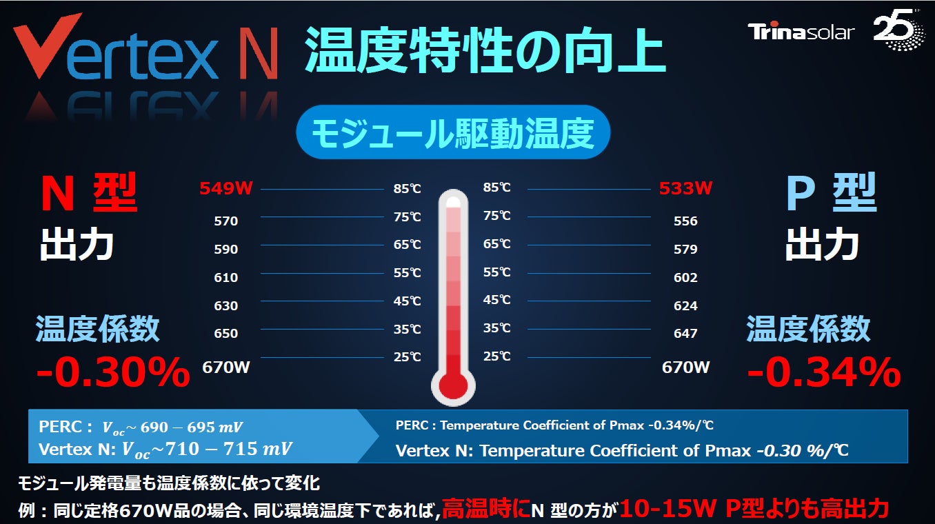 加えて、P型パネルは温度が上がると、発電効率が落ちますが、新N型TOPConセルは、低い温度特性を持つため、モジュールの温度が上がっても高い出力を保つことが可能です。例えば、同じ定格670Wの場合、同じ環境下であればN型の方が高温時に10~15W、P型よりも高出力での発電が可能です。※自社調べ