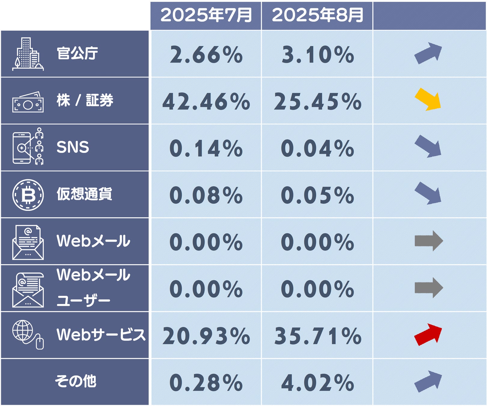 8月度のネット詐欺レポートでは、東京電力(TEPCO)を装うフィッシングサイトの急増が大きな特徴として浮かび上がりました。前月比で約4.7倍という増加は、厳しい「酷暑」による電力需要の高まりと「未払い」、「支払い確認」といった生活に直結する利用者の心理的隙を巧みに突いた攻撃であることを反映しています。これまで証券や銀行といった金融系が主要ターゲットでしたが、今回のようにインフラサービスが狙われることで、被害の裾野がさらに広がる危険性があります。今月特徴的であった電力や交通(ETC利用照会サービスの急増)といった社会基盤に関わる領域は利用者数が多いため、攻撃が成功した際の影響も甚大となります。証券系の動きについては、SBI証券の報告数が減少した一方で、マネックス証券や三菱UFJモルガン・スタンレー証券が新たに標的となるなど、7月にも見られた証券会社間のターゲットローテーションが継続しています。今後もどのブランドが標的となるかは予測困難であり、どの証券会社も狙われる得ることを念頭に警戒することが必要です。さらに国税庁のフィッシングサイトの増加も見逃せません。確定申告シーズンを見越して早期にばらまき始めることで、シーズン本番に利用者を混乱させる狙いが推測されます。攻撃者が「季節性」や「生活イベント」を意識して計画的に詐欺を仕掛けている点は、従来より一歩進んだ傾向と言えるでしょう。