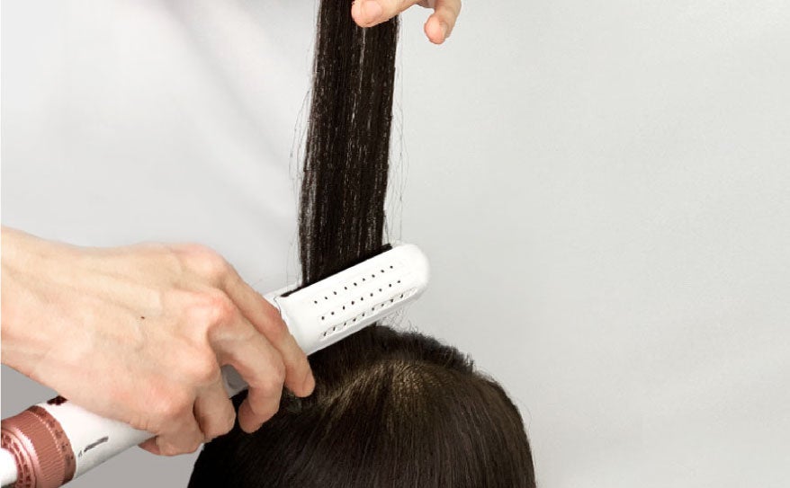 ① トップの毛束を幅2cm程片手で掴んで上へ持ち上げながら、ヘアアイロンを髪の根元にあてる。