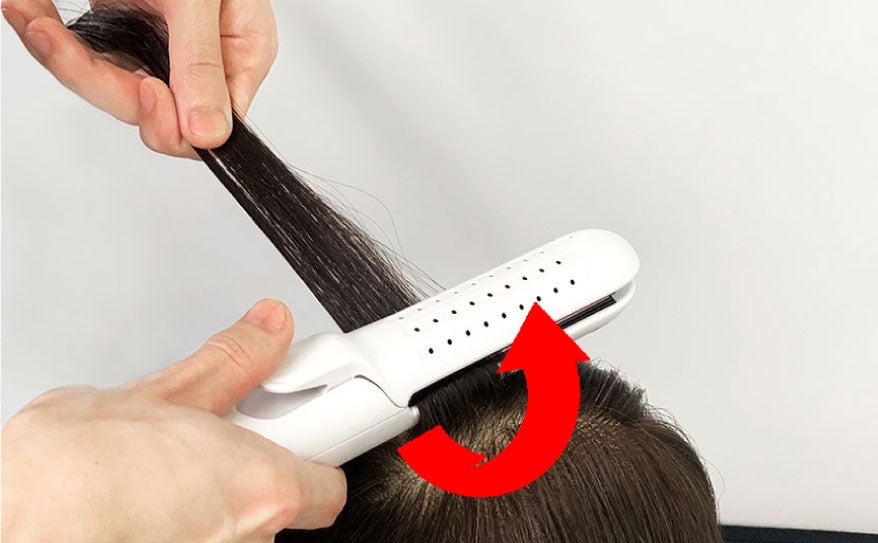 ② ヘアアイロンを持つ手首を少しひねりながら、髪の根元の束を前へ1cm程押し出す。