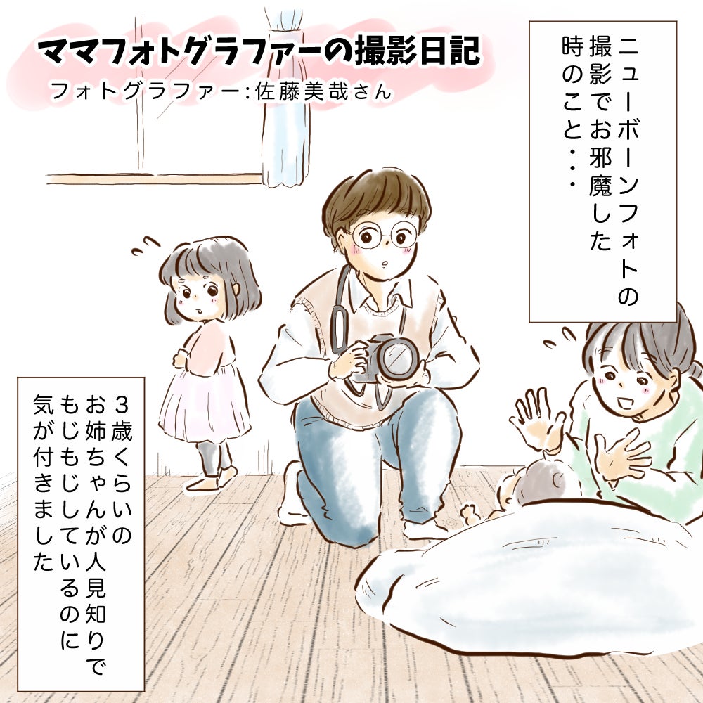 佐藤フォトグラファーが、ニューボーンフォトの撮影をしていると、横で3歳くらいのお姉ちゃんがもじもじしていました。ニューボーンフォトはご家族にとって、リラックスしてゆっくり赤ちゃんに向き合える大切な時間です。フォトグラファーはご家族をよく見て、撮影の時間を気持ちよく過ごせるように心配りをします。人見知りしているお姉ちゃんの気持ちを感じ取った佐藤フォトグラファーは、優しく声をかけていきました。すると、段々と気持ちがほぐれてきたお姉ちゃん。安心して心を開いてもらえたようで、佐藤フォトグラファーの隣で遊びはじめたそうです。