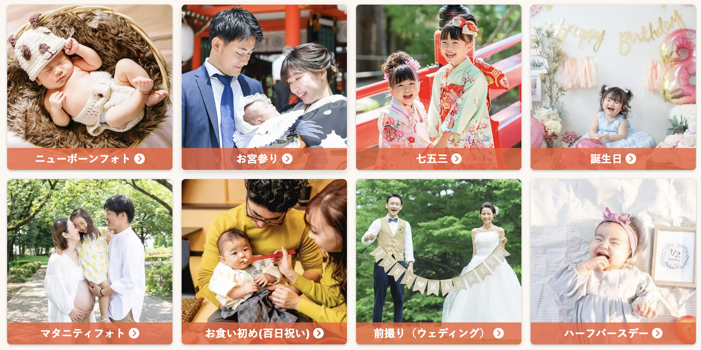 | 納品枚数 | 原則、75枚以上データ納品(ニューボーンフォトのみ40枚以上の納品) ※撮影時の状況または天候等により、当該枚数に達しない場合もあります。 |