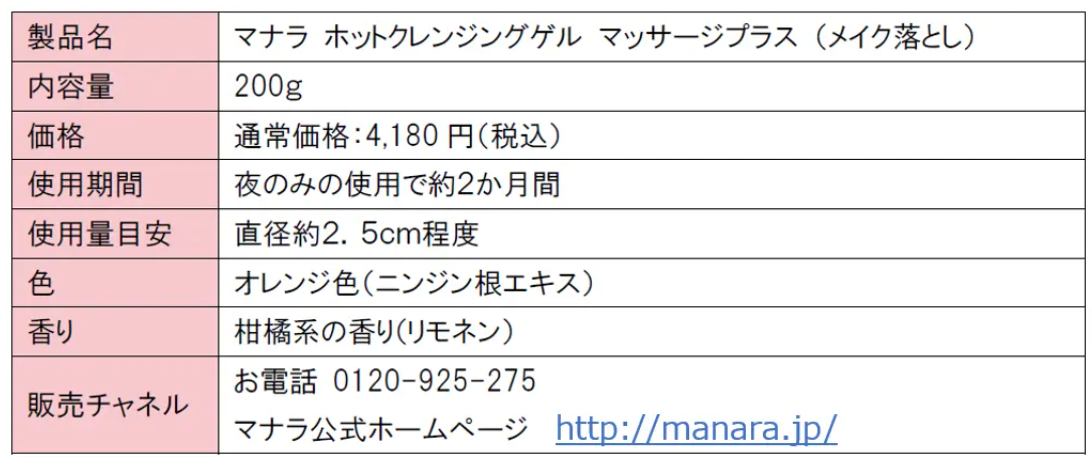 マナラ〈ホットクレンジングゲル マッサージプラス〉:https://manara.jp/product/detail/CG01001S00/