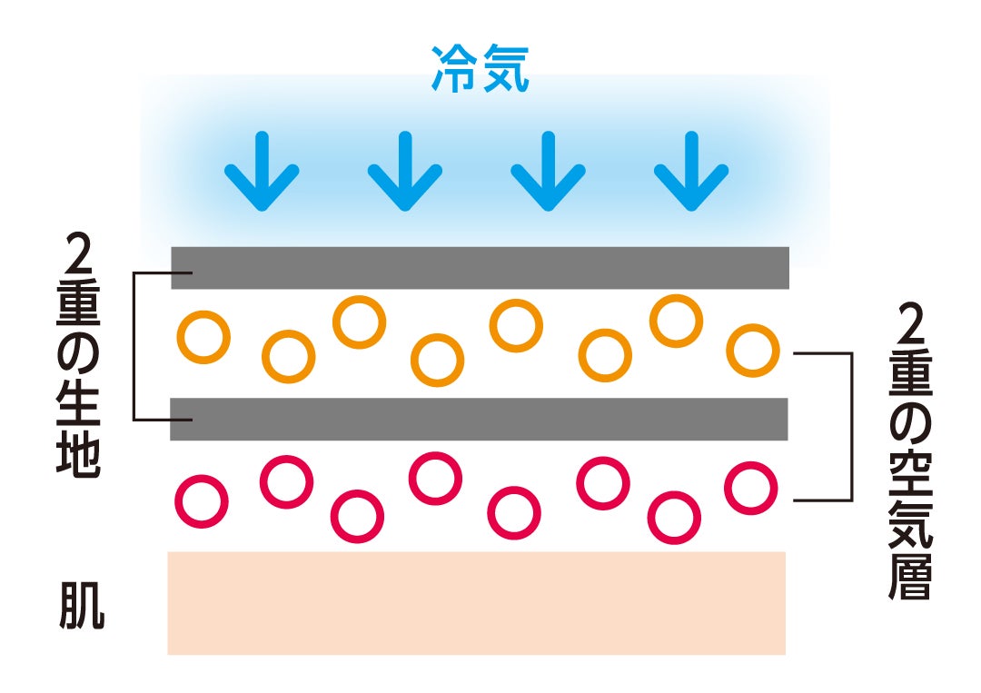 ダブルニットラインは、タイツを重ねばきしたように生地が二枚重なっています。生地と肌の間に加えて、重ねた生地と生地の間にあたためられた空気層がもうひとつでき二重の空気層になることで、あたたかさが持続しやすいのが特徴です。