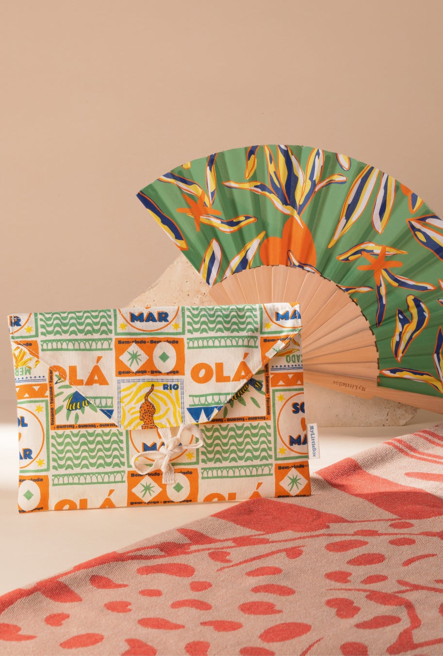 ブラジルスタイルのカラフルなポーチ、ビーチタオル、扇子を揃えてバカンスへ