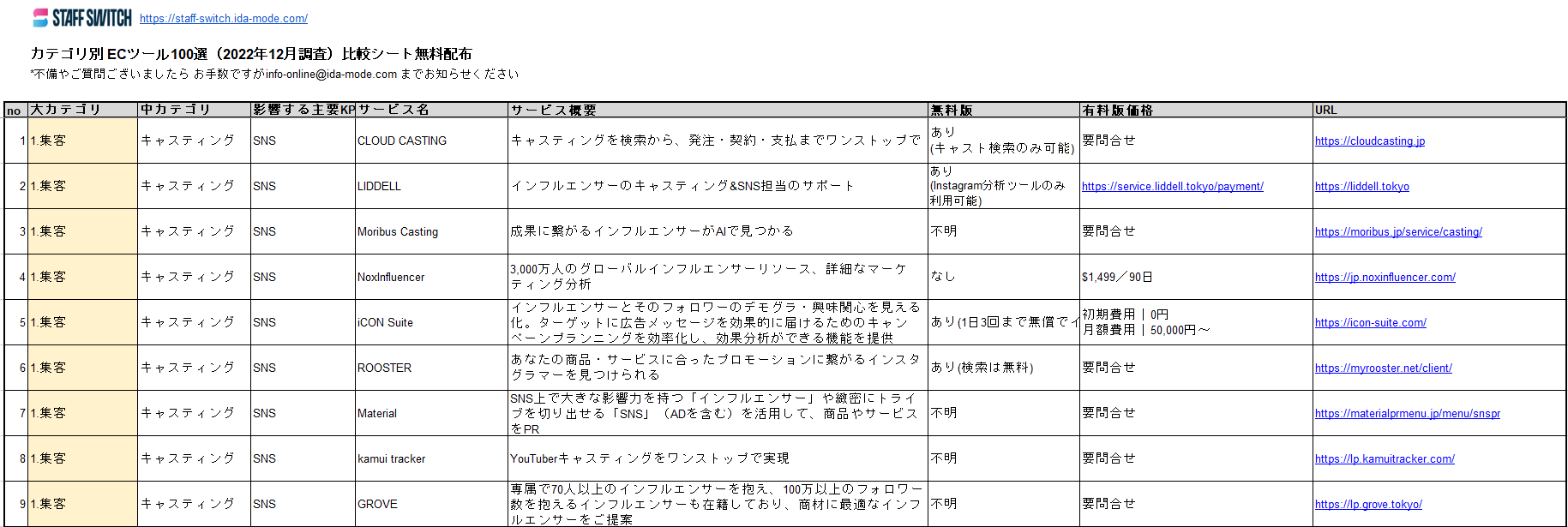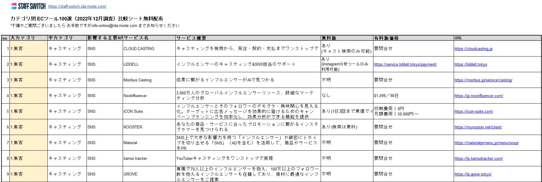 株式会社 iDA(アイ・ディ・エー、以下iDA / 本社:東京都渋谷区、代表取締役社長 堀井 謙一郎) は、アパレル企業で自社EC売上・CVR向上のための施策を検討しているEC事業担当者に向けた「カテゴリ別 ECツール100選 比較シート」を無料配布します。