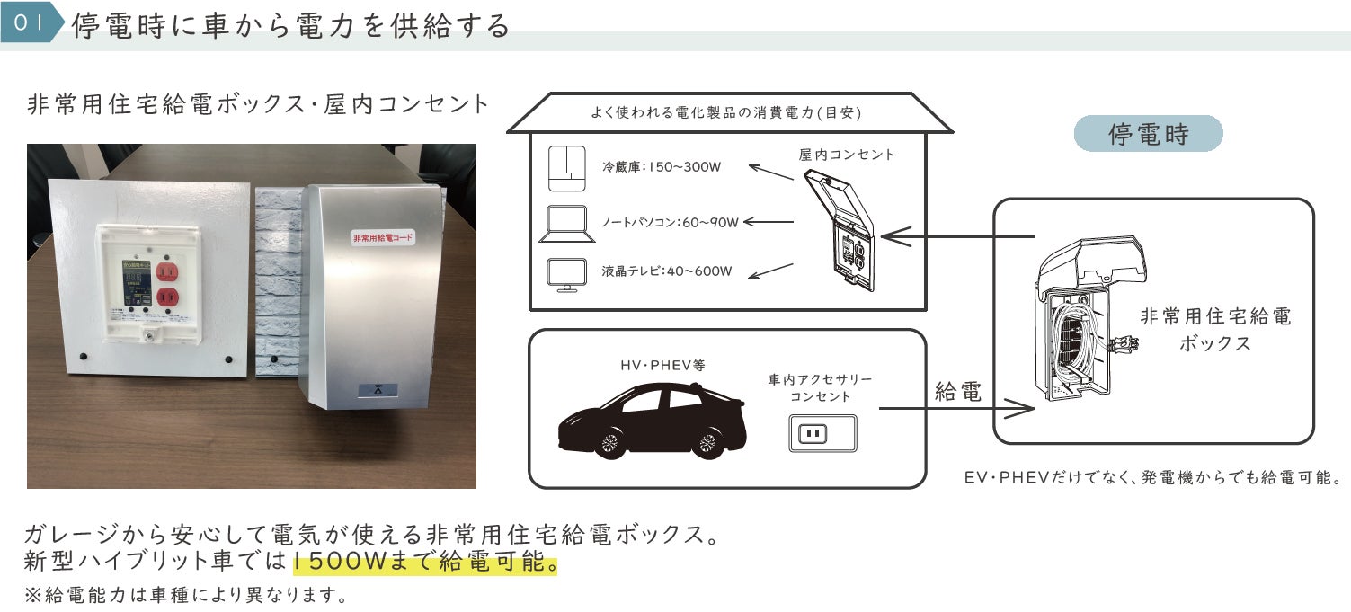 この度、株式会社アイダ設計(本社:埼玉県さいたま市大宮区桜木町、代表取締役社長:會田 貞光)は、アイダ設計の建築する住宅(新規契約)を対象に、停電時にEV・PHEV車から電力を供給する為の「住宅用安心給電キット」と、EV・PHEV車を充電するコンセントをセットにしたオプションパックを販売開始いたします。