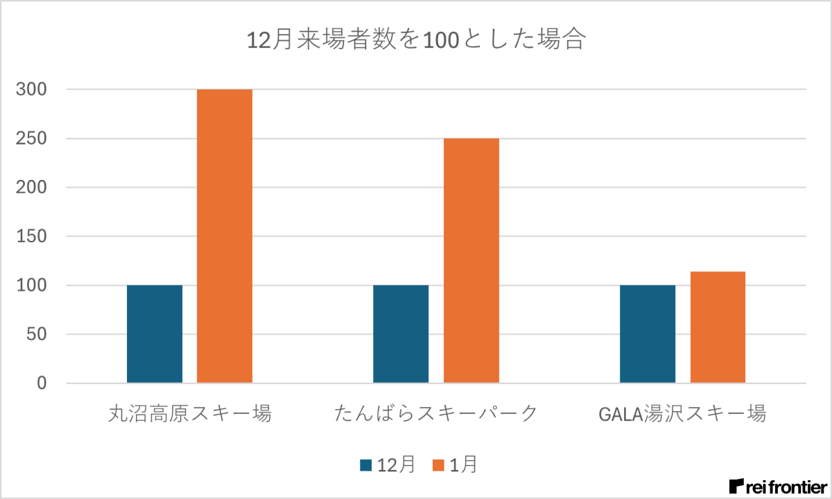 12月来場者数を100とした場合、それぞれのスキー場における1月来場者数を比較しました。