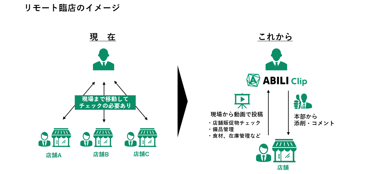 解決策の一つとして、業務のDX化推進による生産性向上が必須と考えていた中でABILI Clipの存在を知り導入を検討しておりました。店舗SVは、ABILI Clipの動画や画像などの双方向コミュケーション機能を活用し、管理レベル強化に加え、リモート化によりこれまで掛かっていた実移動時間を店舗管理業務に充て効率化と生産性向上を目指します。