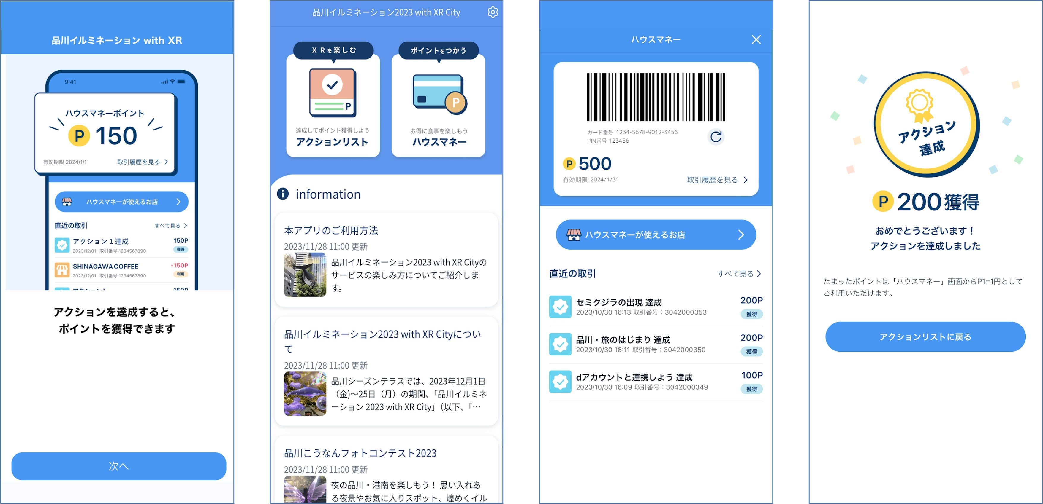 バリューデザインが提供するポイント機能は、イベント専用アプリ「品川イルミネーション2023 with XR City」に採用されています。イベント参加者が品川港南エリア全6スポットに隠されたXRコンテンツを見つけると、アプリに限定ポイントを付与。イベント参加者は、獲得したポイントを品川シーズンテラスにある店舗※2で利用できます。