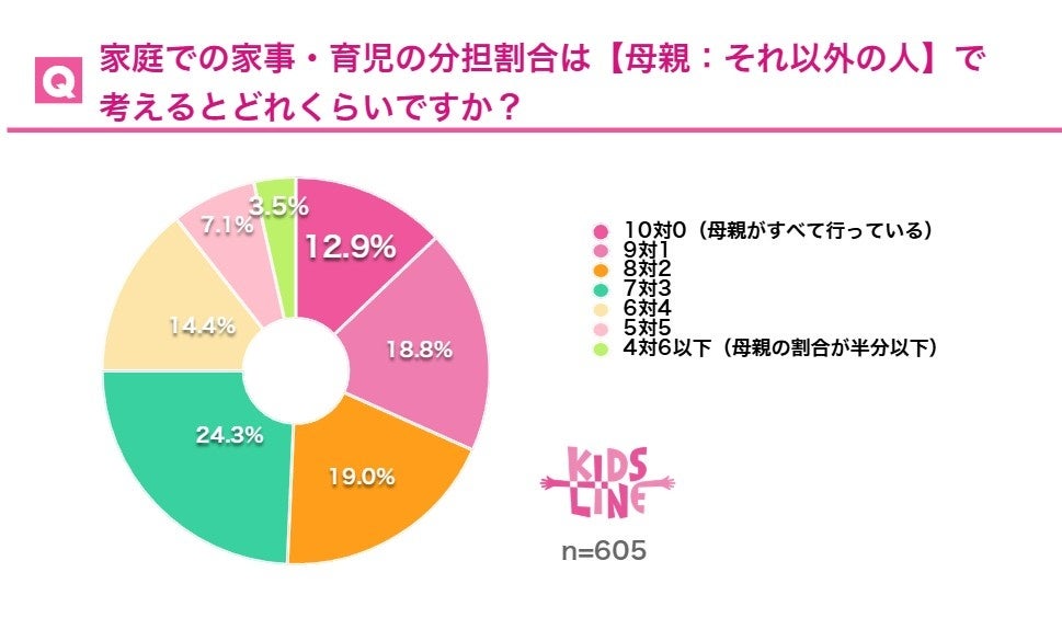家事・育児の分担割合を「母親:それ以外の人」の比率で聞いた結果、「10:0(母親がすべて担う)」が12.9%、「9:1」が18.8%となり、あわせて31.7%の家庭で“母親が9割以上担っている”ことがわかりました。「8:2」(19.0%)や「7:3」(24.3%)まで含めると、75%以上の家庭で母親に大きく負担が偏っている実態が浮かび上がります。