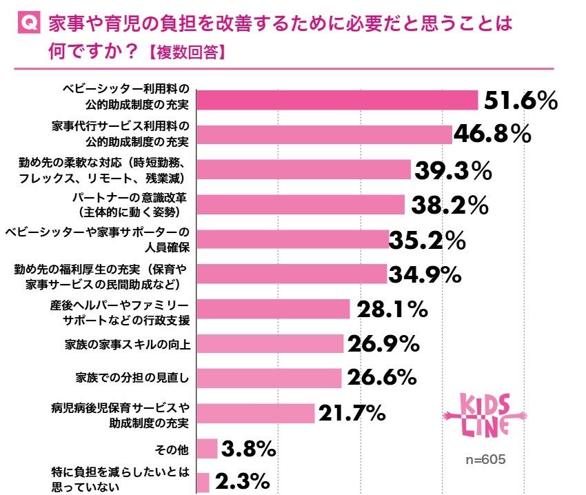 特に注目すべきは、いずれの選択肢よりも「特に負担を減らしたいとは思っていない」と答えた人がわずか2.3%にとどまった点です。ほぼすべての母親が“今のままでは負担が大きい”と感じ、改善を必要としている現状が、今回の調査結果から浮かび上がりました。