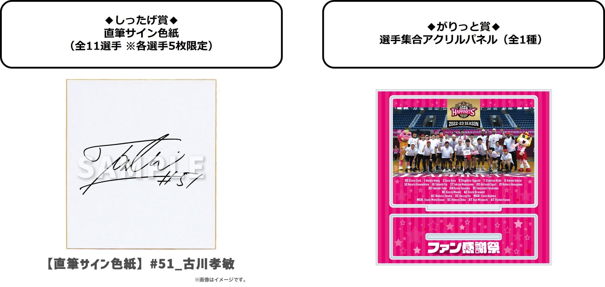 この度の「AKITA NORTHERN HAPPINETS オンラインカプセルくじ」では、チームに所属する選手の直筆サイン色紙や、グッズでは初めてとなる『ファン感謝祭』での写真素材を使用した、他では手に入らない超限定の景品が揃っています。ハズレなしのくじとなっていますので、ファンの皆様には「ハッピーとワクワク」を実感していただくことができる企画となっています。