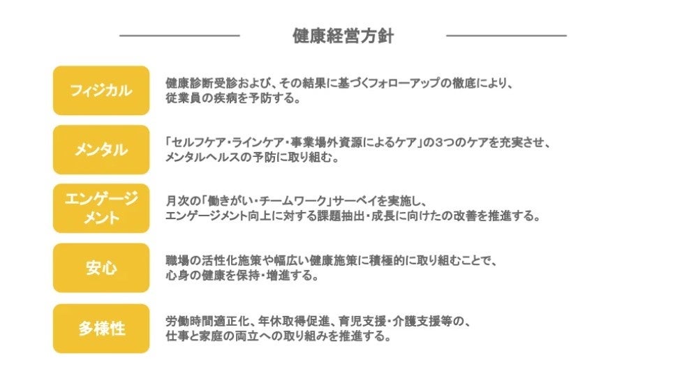 下記、健康経営方針に則り、健康経営を実践しております。