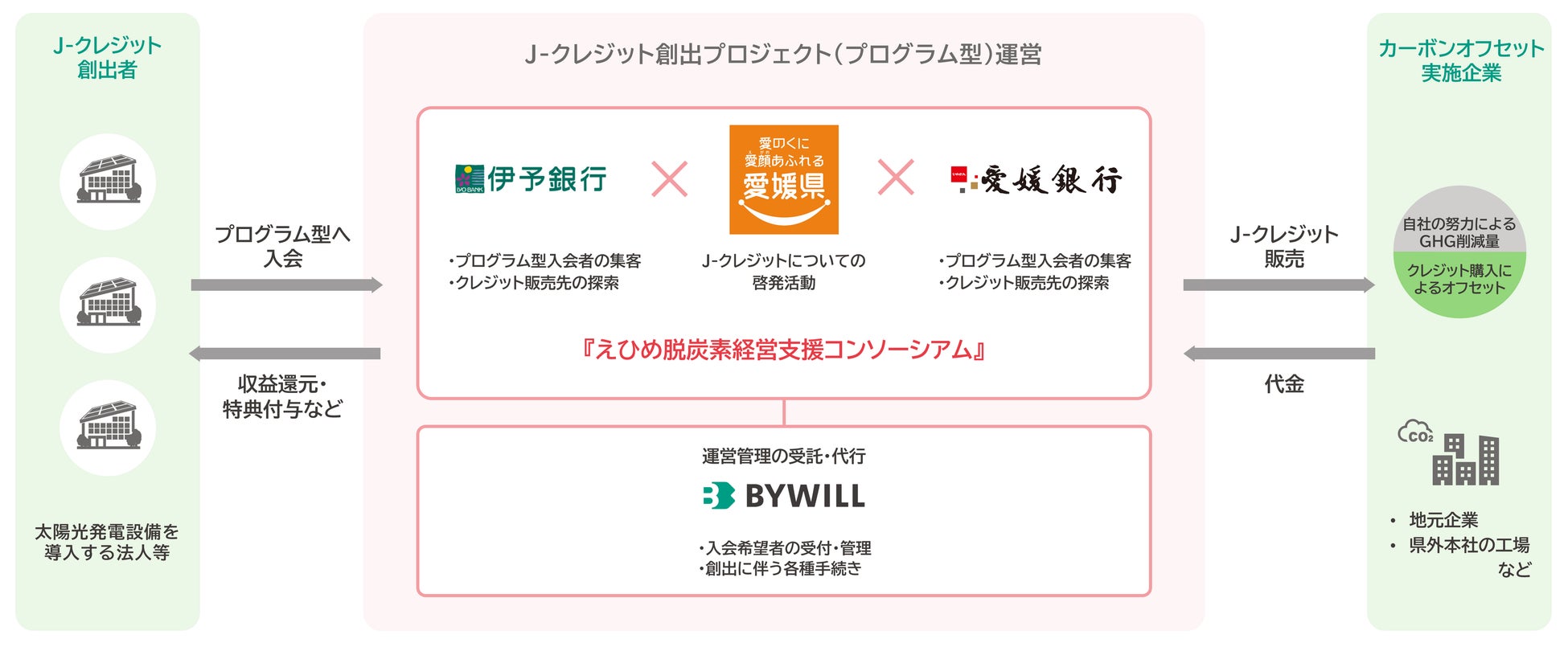 バイウィルはプログラム型プロジェクトの運営、J-クレジット創出手続き、J-クレジット販売先の探索を代行する予定です。バイウィルが都道府県と連携協定を締結するのは、愛媛県が初めてです。