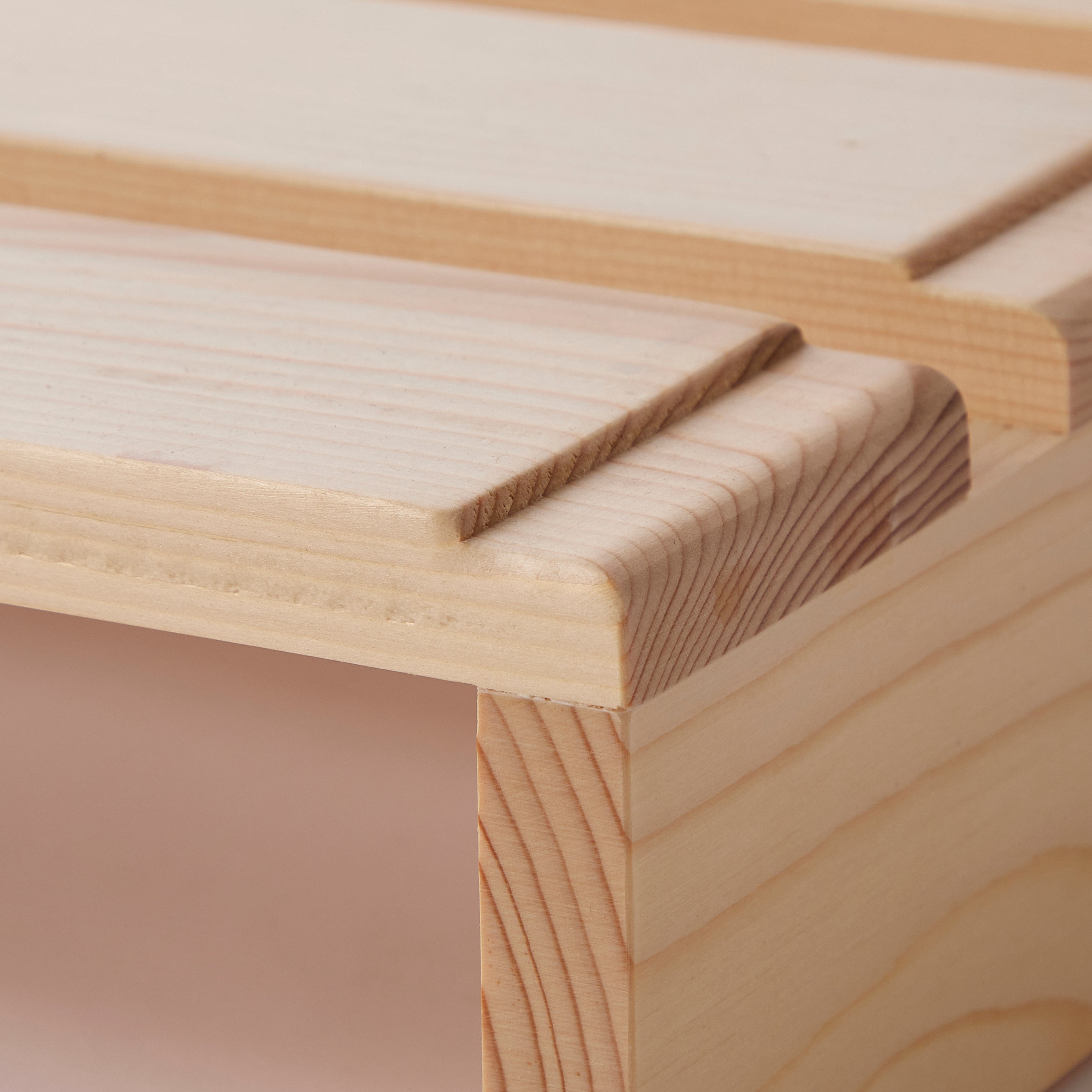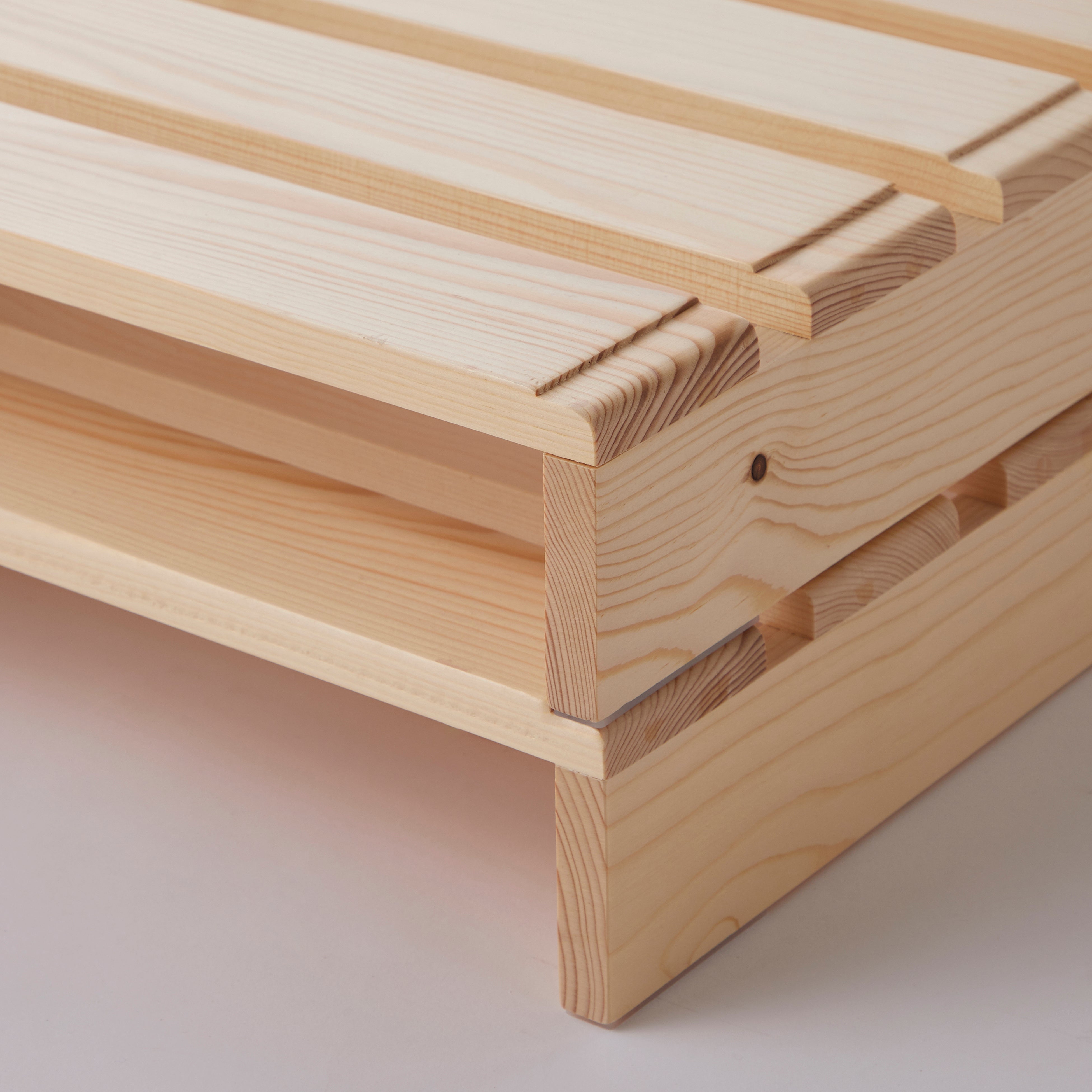 今回の商品リニューアルの一番のポイントは、連結用の専用金具が不要になり「置くだけ」で設置が完了するようになった点です。従来は各パレット同士を専用金具で連結する仕様でしたが、今回、底面の傷防止フェルトを滑り止めシートに変更することで、パレット風ベッドを複数枚並べて「置くだけ」、その上に敷布団やマットレスを載せるだけで、快適に使っていただける仕様にリニューアルしました。