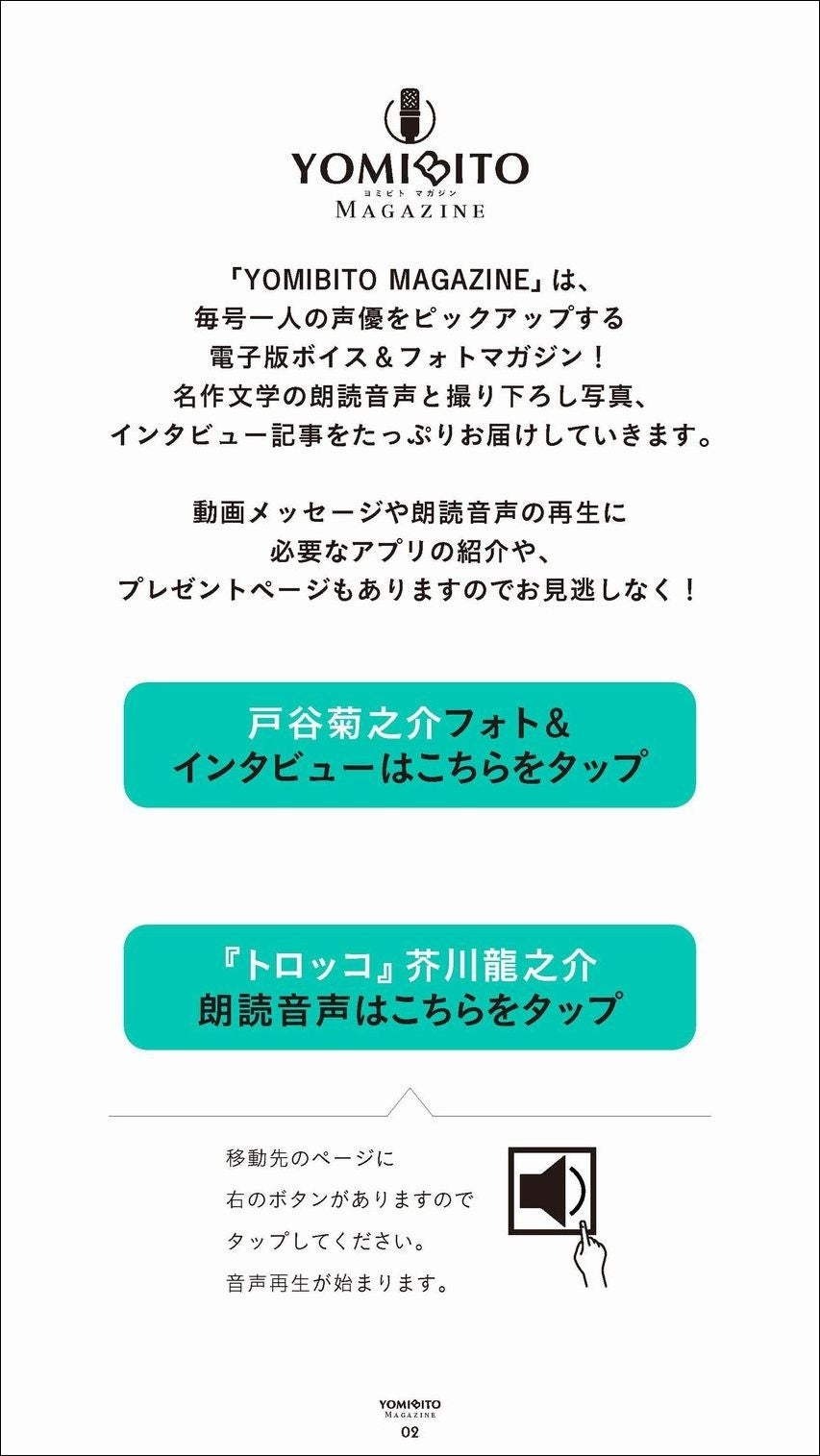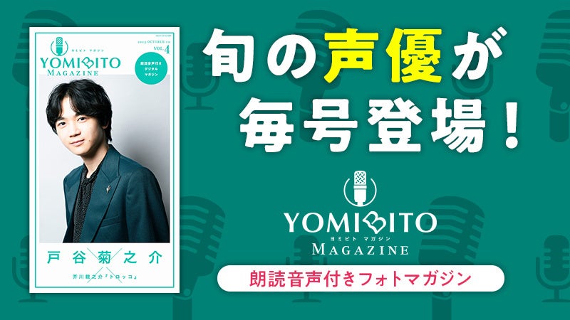株式会社ソニー・ミュージックエンタテインメントは、朗読音声付きデジタルマガジン「YOMIBITO MAGAZINE(ヨミビト マガジン)」の最新号『YOMIBITO MAGAZINE vol.4~戸谷菊之介』を2023年10月10日(火)より電子書籍ストア「Reader Store」にて独占配信いたします。