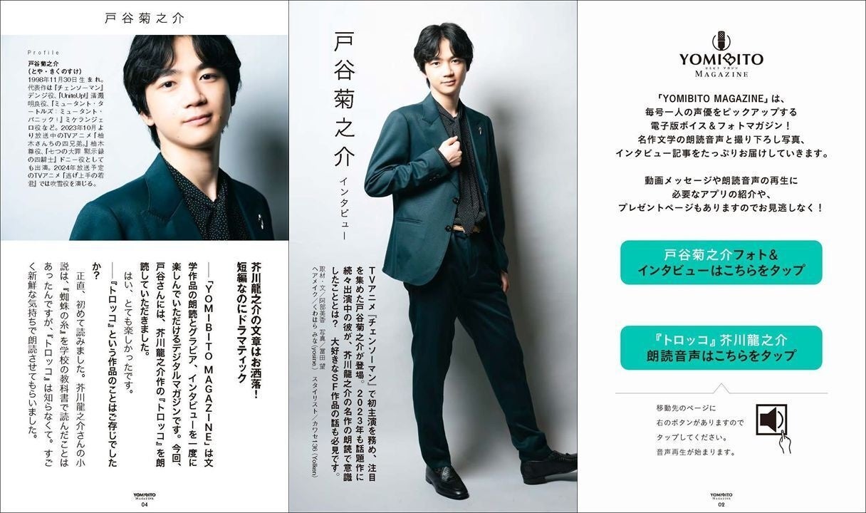 10月10日配信の最新号(vol.4)では、『チェンソーマン』デンジ役などで人気の戸谷菊之介が芥川龍之介の短編小説『トロッコ』を朗読。約18分の朗読音声のほか、16カットにおよぶ撮り下ろし写真やロングインタビュー、そして動画メッセージも収録した、声優・戸谷菊之介の魅力が満載の一冊です。