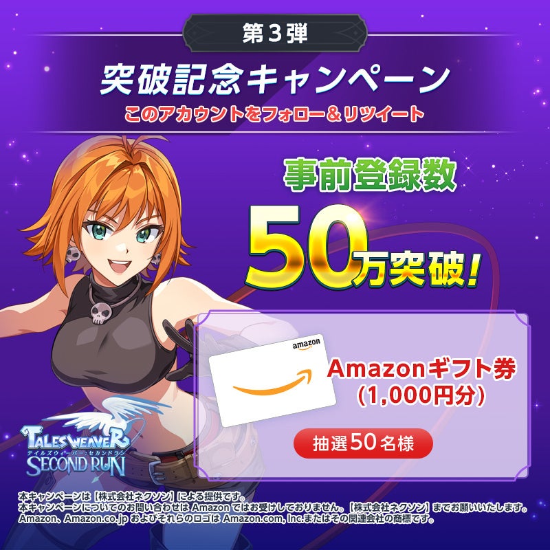 事前登録者数の目標突破を記念して、Amazonギフトカード 1,000円分をプレゼントするリツイート(RT)キャンペーンが開催中です。