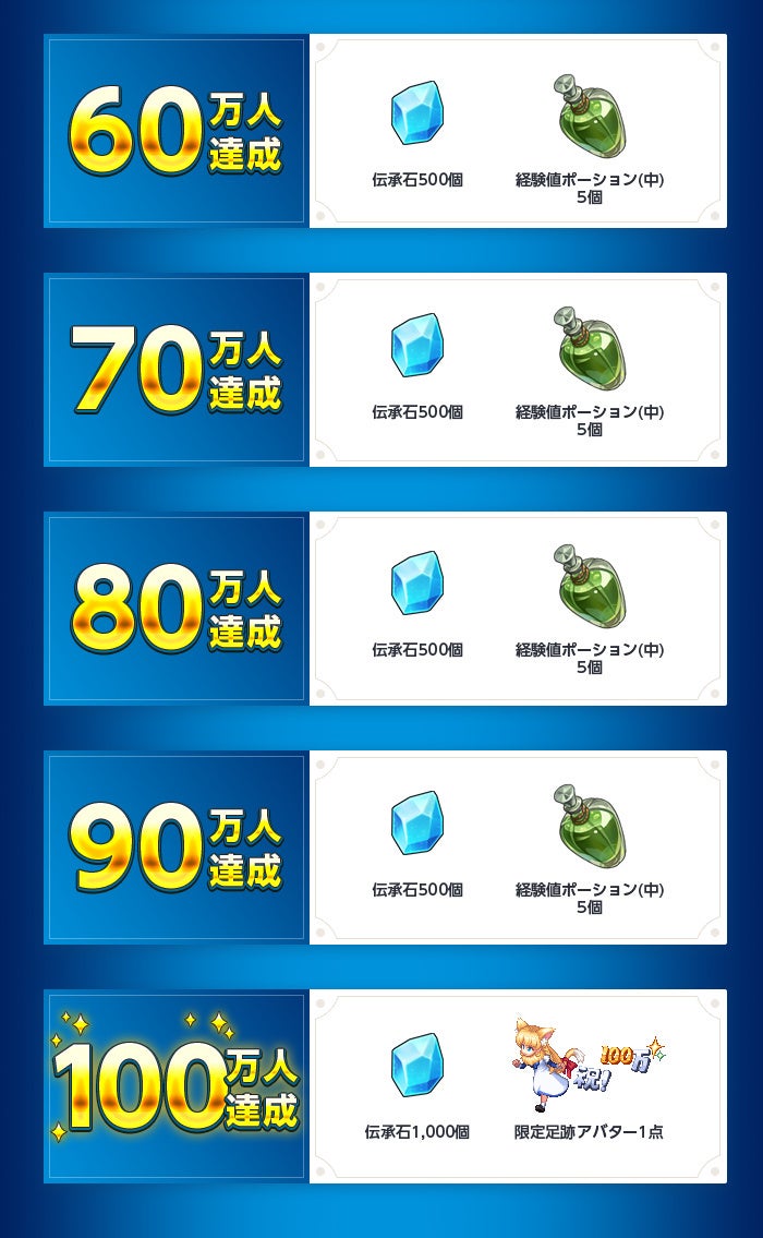 60万人:伝承石×500個、 経験値ポーション(中)×5個