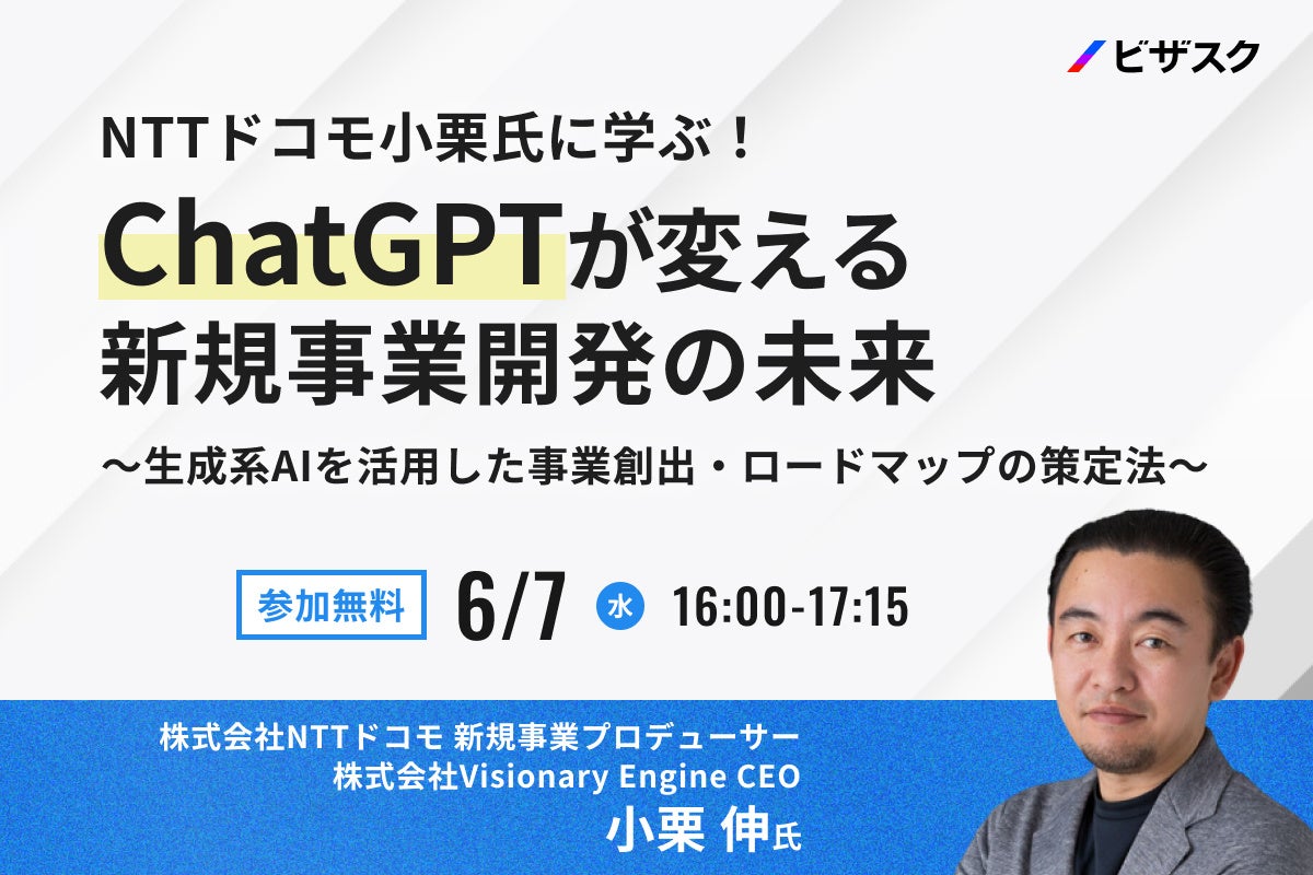 【6/7(水)16時】NTTドコモ小栗氏に学ぶ!「ChatGPTが変える新規事業開発の未来〜生成系AIを活用した事業創出・ロードマップの策定法〜」無料オンラインセミナーを開催