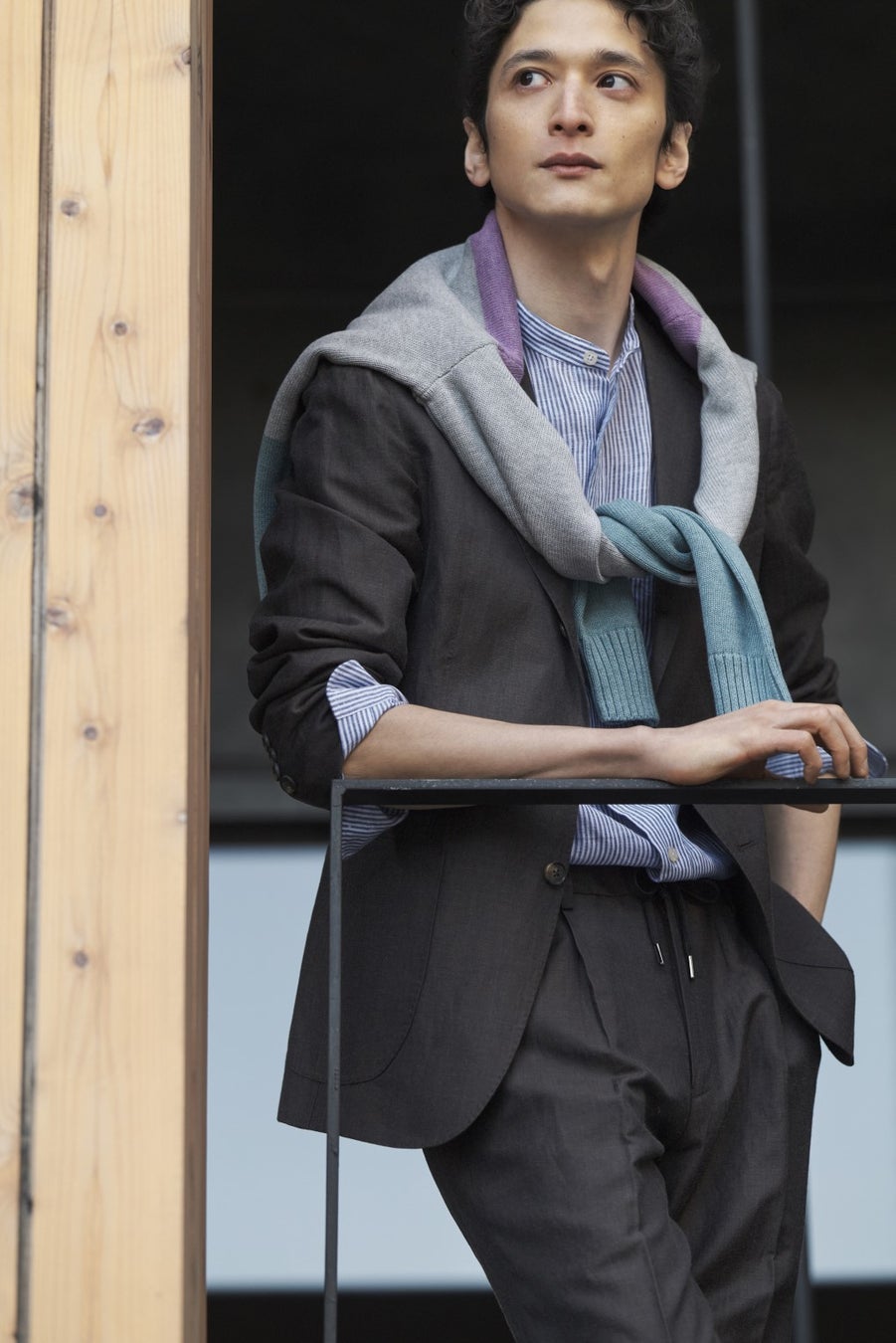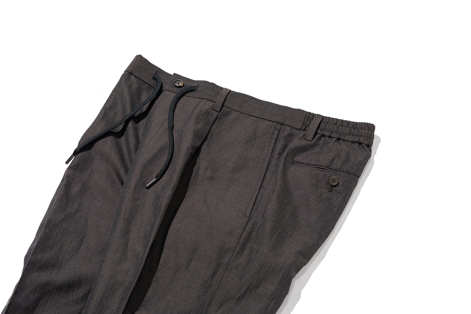 TOKYO FITのジャケットにリラックス仕様のトラウザーズを組み合わせたのが「EASY SUIT」。アンコン仕立てのジャケットにリネンやラミー混の清涼素材を載せ、春夏の優雅さを全面に打ち出しています。パンツはウエストの背面が伸縮するハーフシャーリングにドローコードをプラス。腰周りの締め付け感を大きく軽減しています。ベルトループもセットしているため、クラシックなスラックスとして着用することも可能。