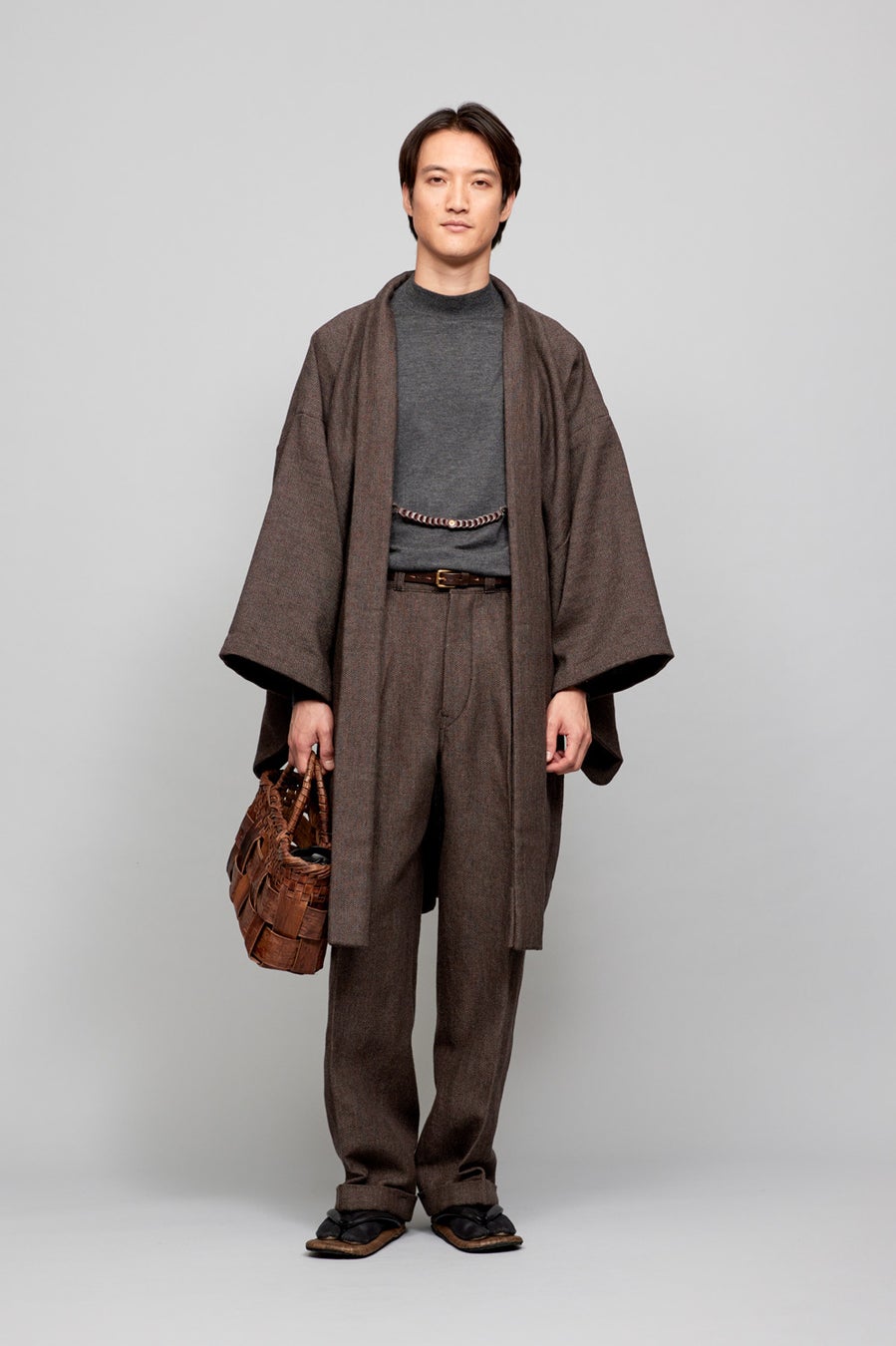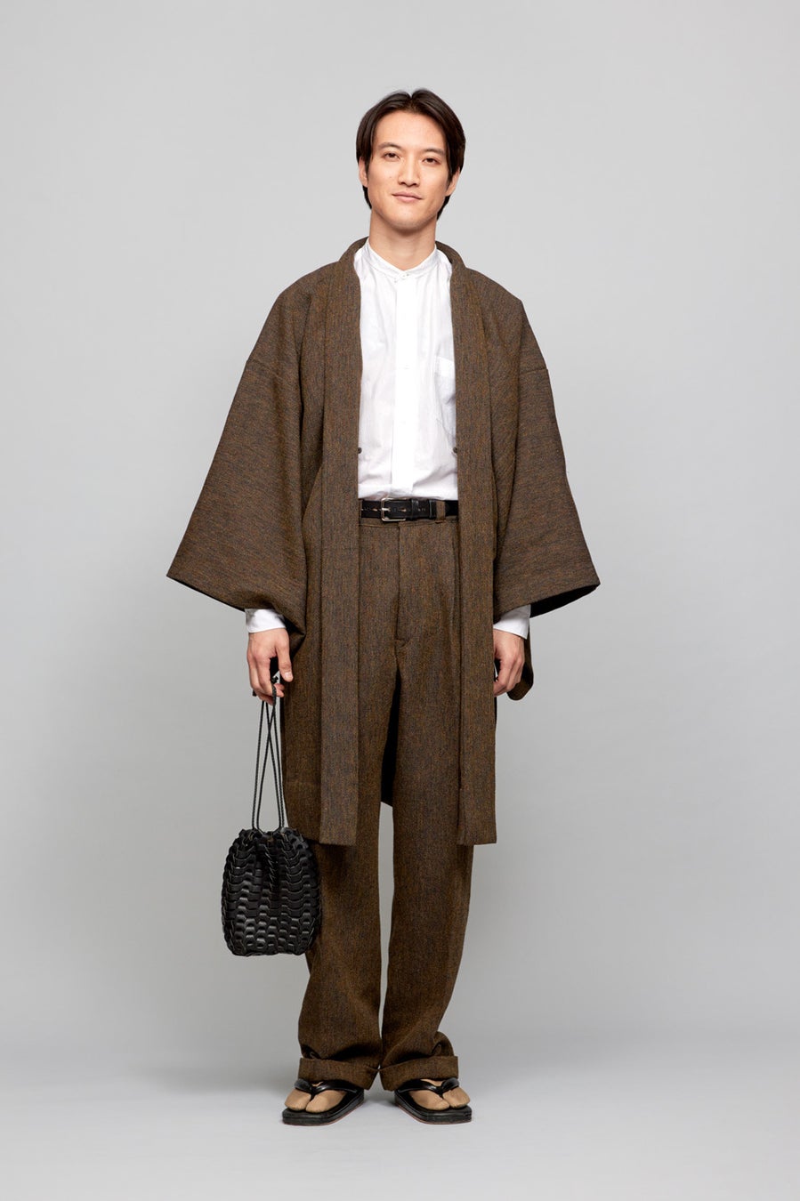 パンツは1940年代のアメリカ製ワークパンツを基にしたT.Tオリジナルのワークトラウザーズをセレクト。羽織と同素材のため、セットアップとしての相性も抜群です。羽織とパンツは共にブラウンとグレーの二色展開で、スタイリングの幅を広げてくれます。