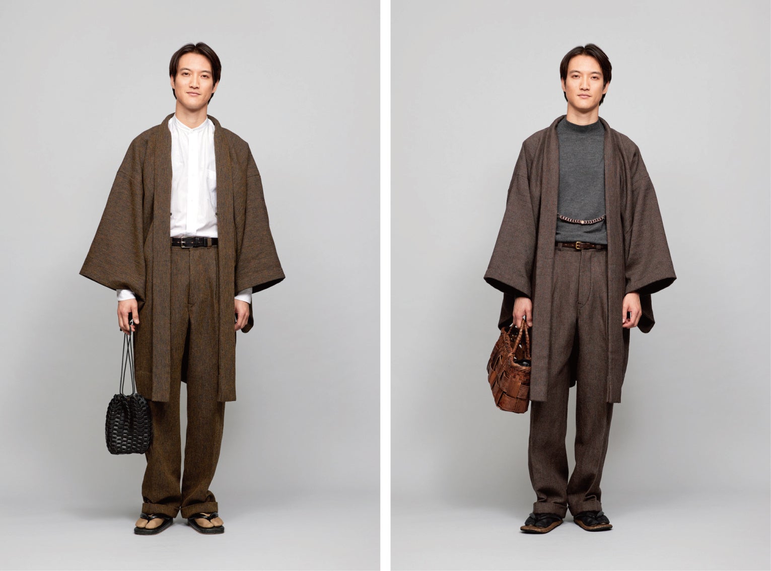 T.Tが過去の生地の研究を重ね、AW24コレクションで発表した生地を用いて羽織を展開し、<Y. & SONS>らしいセットアップスタイルを提案します。