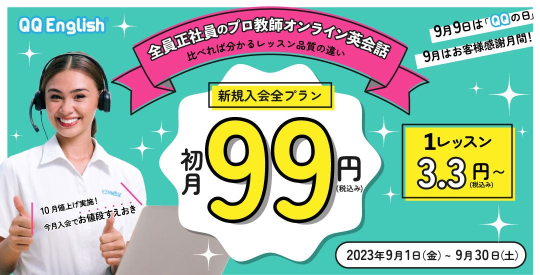 QQEnglishでは、9月から英語学習をスタートされる皆さまを応援する「新規入会 全プラン初月99円キャンペーン」を実施いたします。